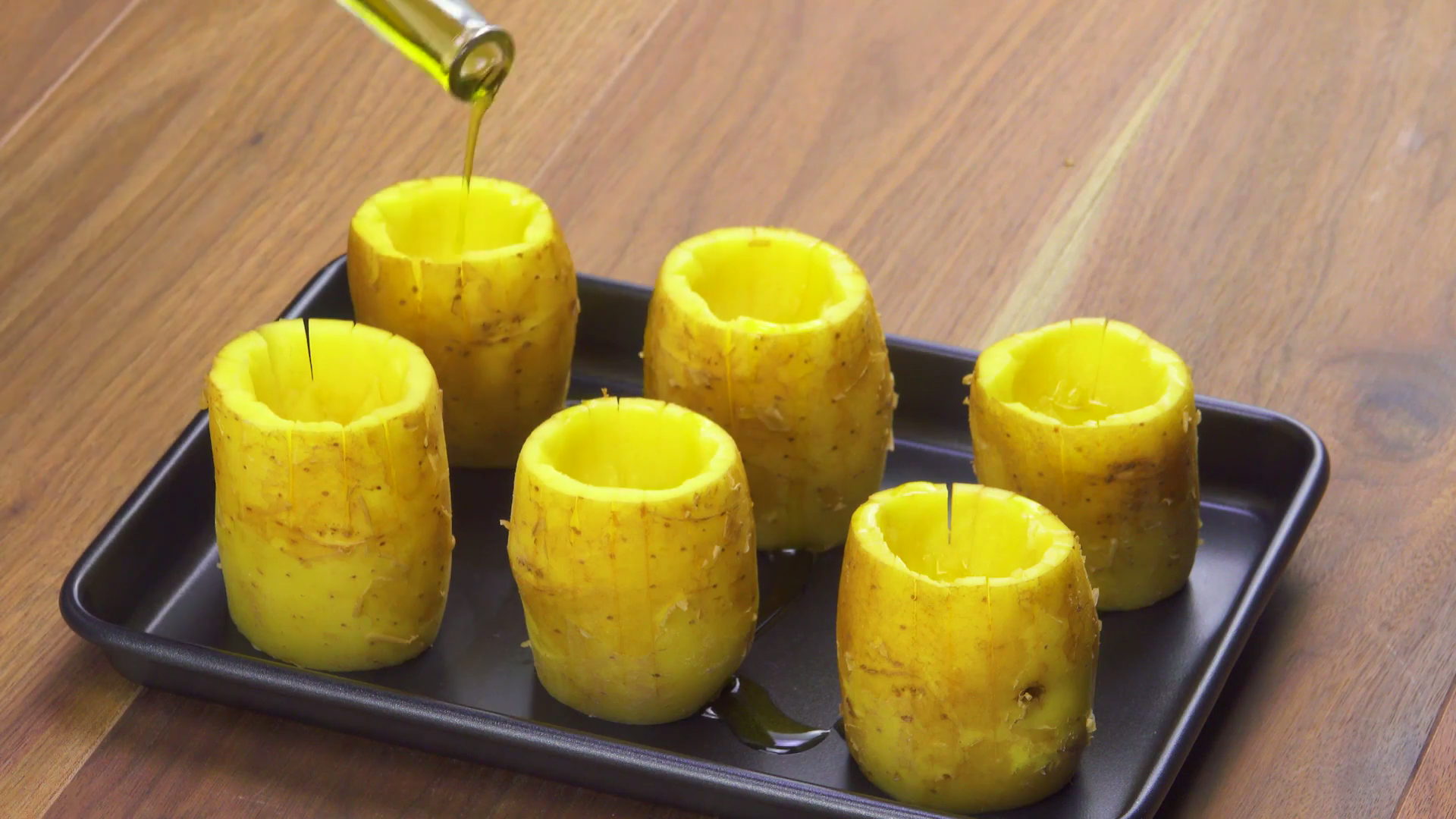 Schneide von den beiden Enden der Kartoffeln ein kleines Stückchen ab, sodass eine Standfläche entsteht. Mit einem Messer schneidest du dann einen kleinen Kegel aus jeder Kartoffel, dessen Ränder du längs einschneidest.