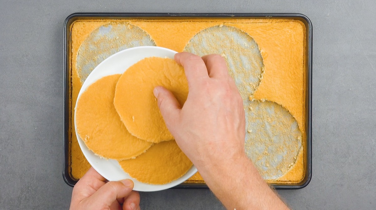 Schneide den Biskuitboden dann mithilfe einer Schale in Kreise; die zugeschnittenen Biskuitkreise sollten so groß sein, dass sie später in die Melone passen.