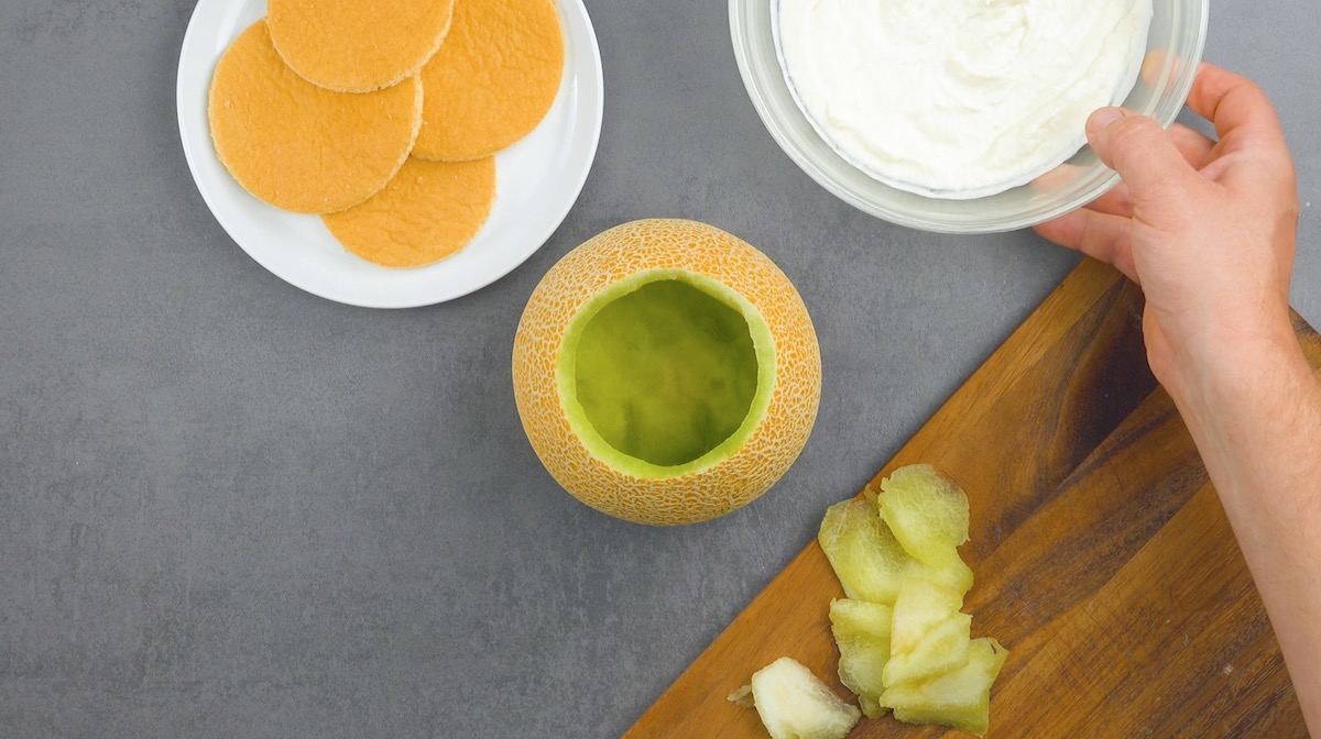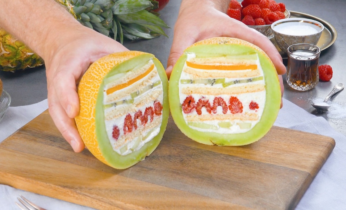 Dieses köstliche Obst lässt sich übrigens nicht nur in Stücke geschnitten oder direkt aus der Schale verspeisen, sondern schmeckt auch in diversen Variationen. Wir präsentieren dir heute ein Rezept, in dem eine handelsübliche Netzmelone mit Biskuit, Creme und diversen Früchten gefüllt wird: