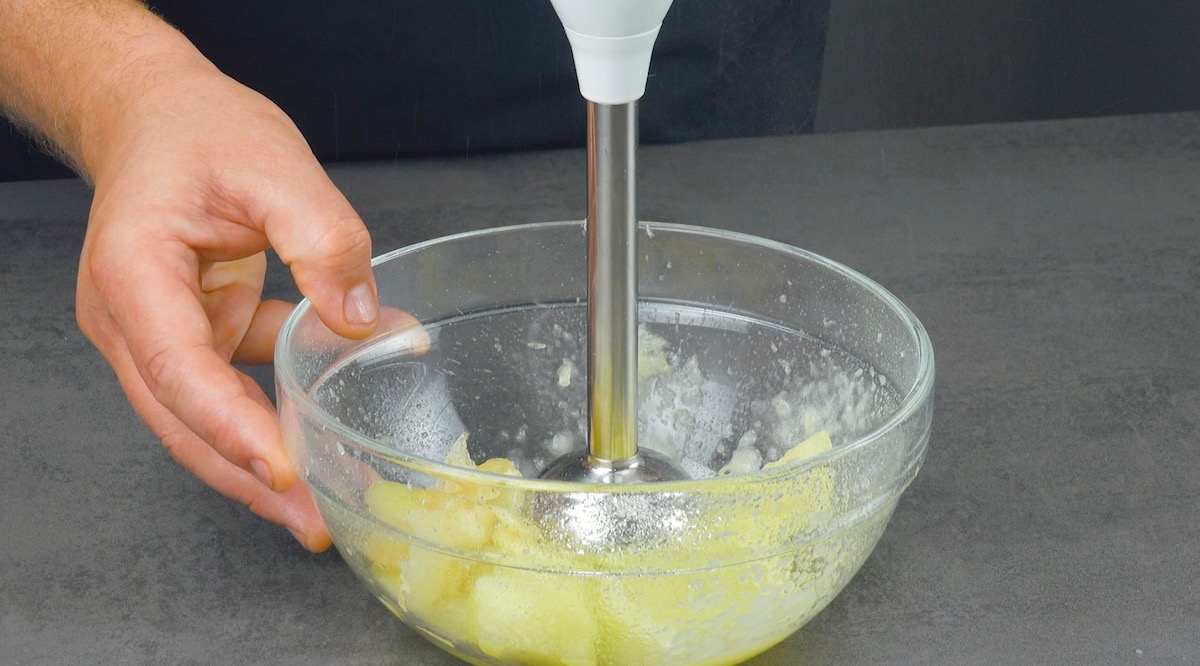 4. Rühre für die Creme Frischkäse, Zucker, Sahne und Vanillearoma unter das Melonenpüree.