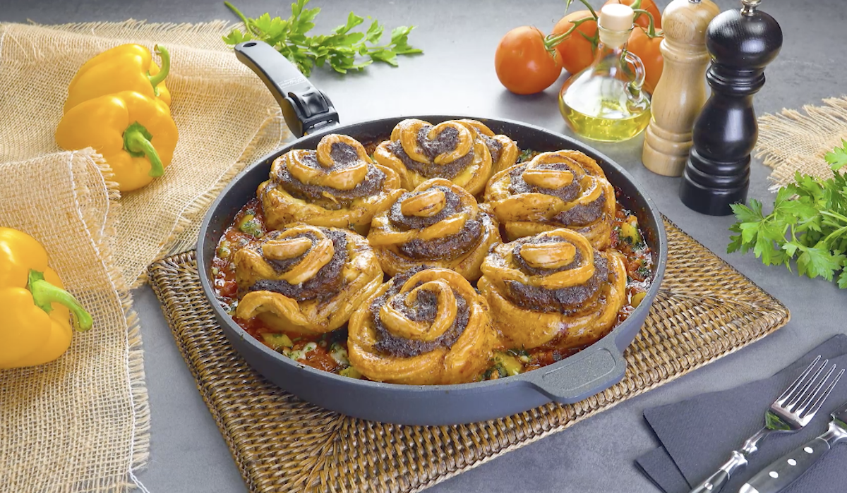 6. Rolle alles zu einer Rose zusammen und setze diese in die Paprikahälften in der Pfanne. Bepinsle den Teig noch mit verquirltem Ei. Schiebe die Pfanne dann bei 190 °C Ober- und Unterhitze für 45 Minuten in den Ofen.