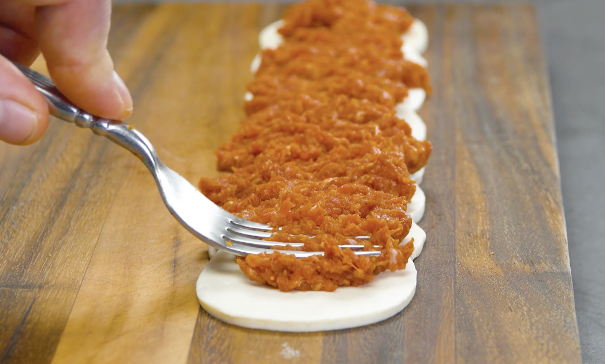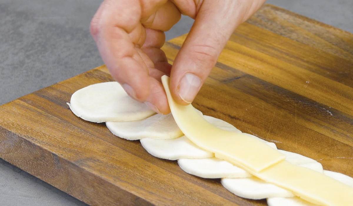 4. Lege nun immer 8 Kreise überlappend aneinander. Damit sie besser aneinander haften, „verklebe“ sie mit verquirltem Ei. Belege die Kreise nun mit Käse.