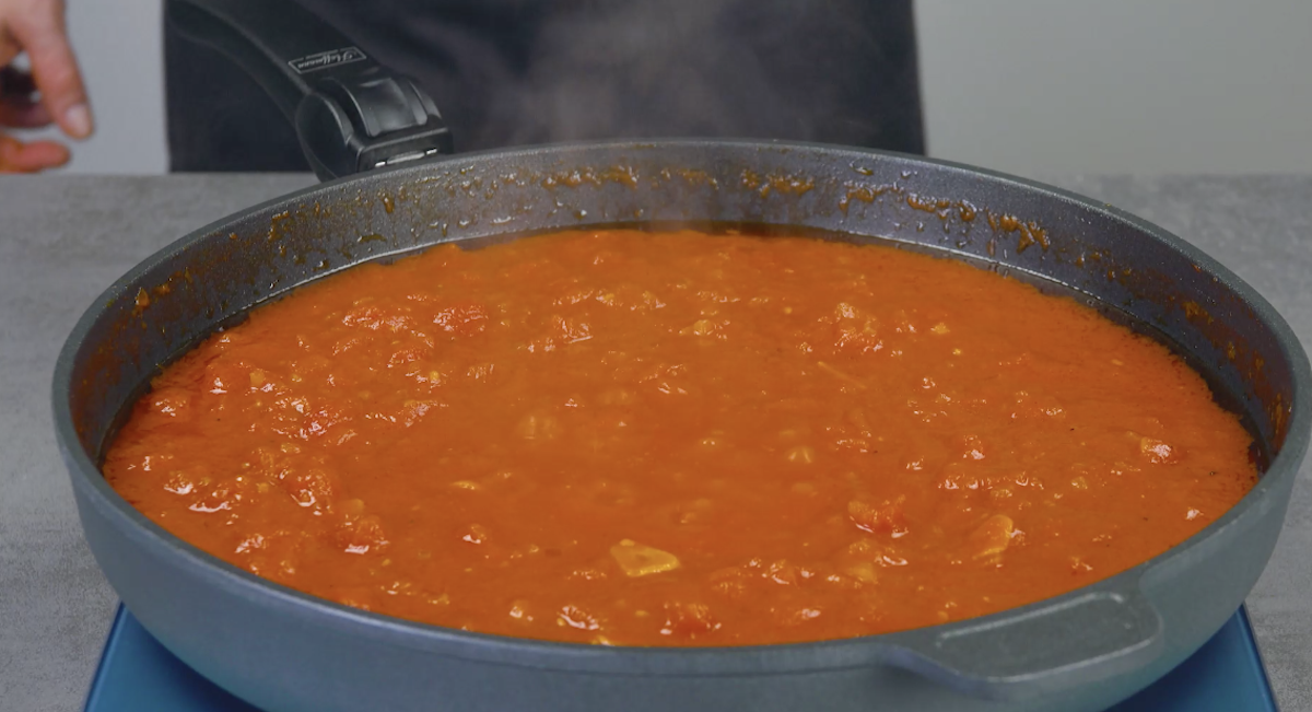 1. Erhitze Olivenöl in der Pfanne und schwitze Zwiebeln und Knoblauch glasig an. Gib dann Honig hinzu und lasse alles glasieren. Rühre anschließend Tomatenmark mit ein und schwitze es kurz mit an. Am Schluss kommen die gehackten Tomaten hinzu. Lasse alles etwas köcheln und schmecke es mit Salz und Pfeffer ab.
