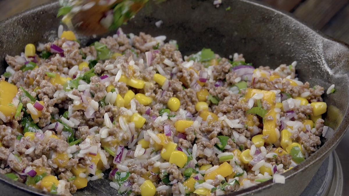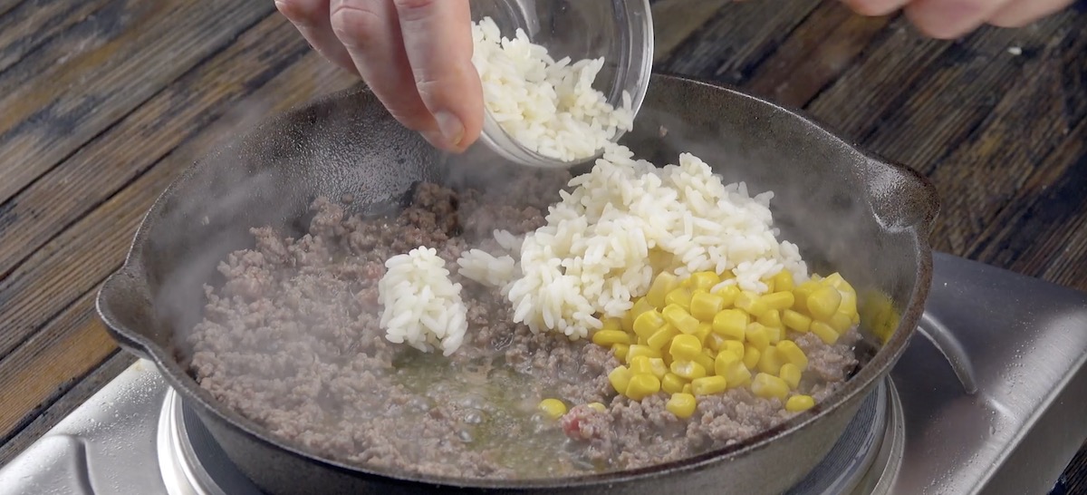 1.1) Erhitze Öl in einer Pfanne. Gib dann das Hackfleisch hinzu, würze es mit Salz und Pfeffer und brate es zusammen mit dem Mais und dem gekochten Reis an.