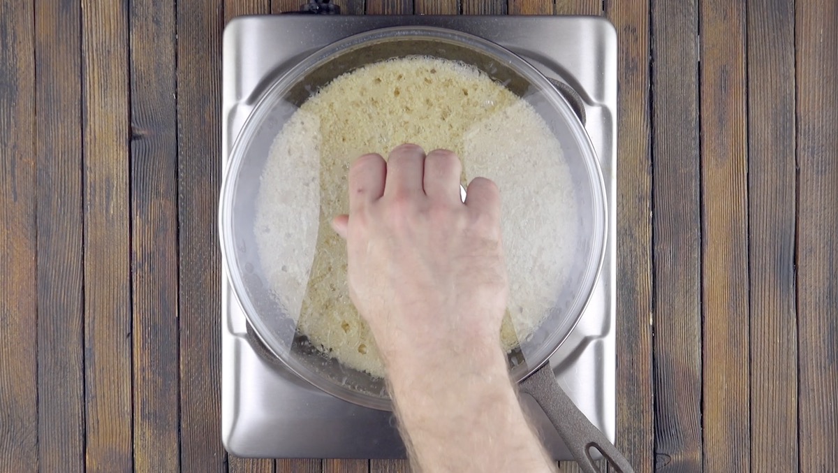 2.1) Erhitze für die Paprikas mit der Couscousfüllung zunächst die Gemüsebrühe und den Couscous, zugedeckt in einer Pfanne, so lange, bis der Couscous aufgequollen ist.