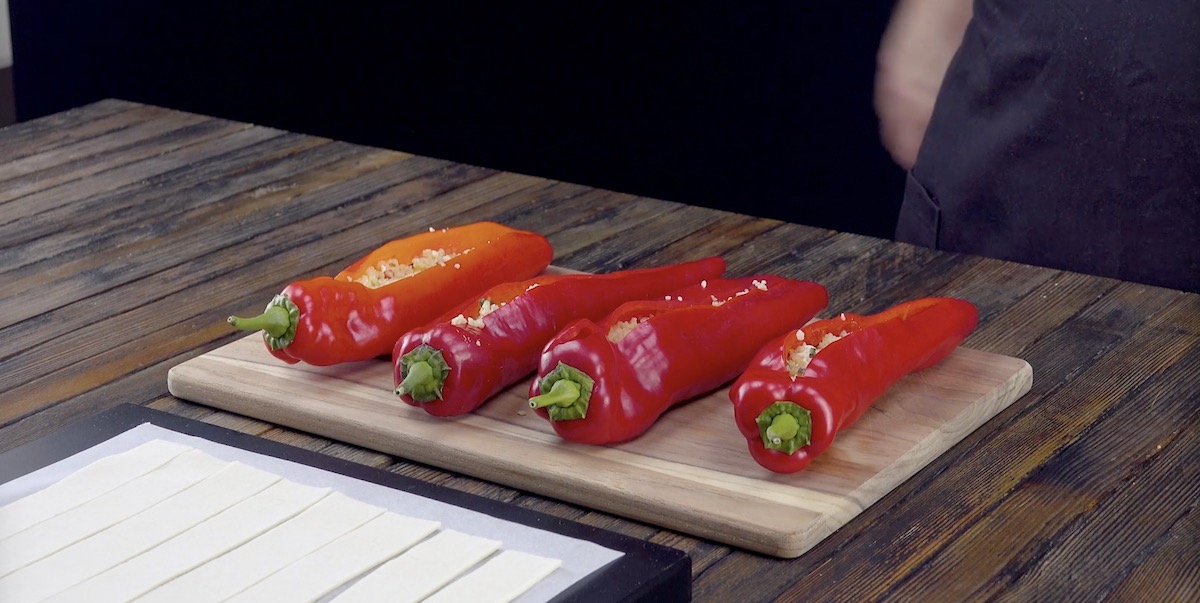 2.4) Schneide nun den zweiten Blätterteig ebenfalls in längliche Streifen, schlitze die Paprikas auf, höhle sie aus und fülle sie mit der Couscousfüllung.