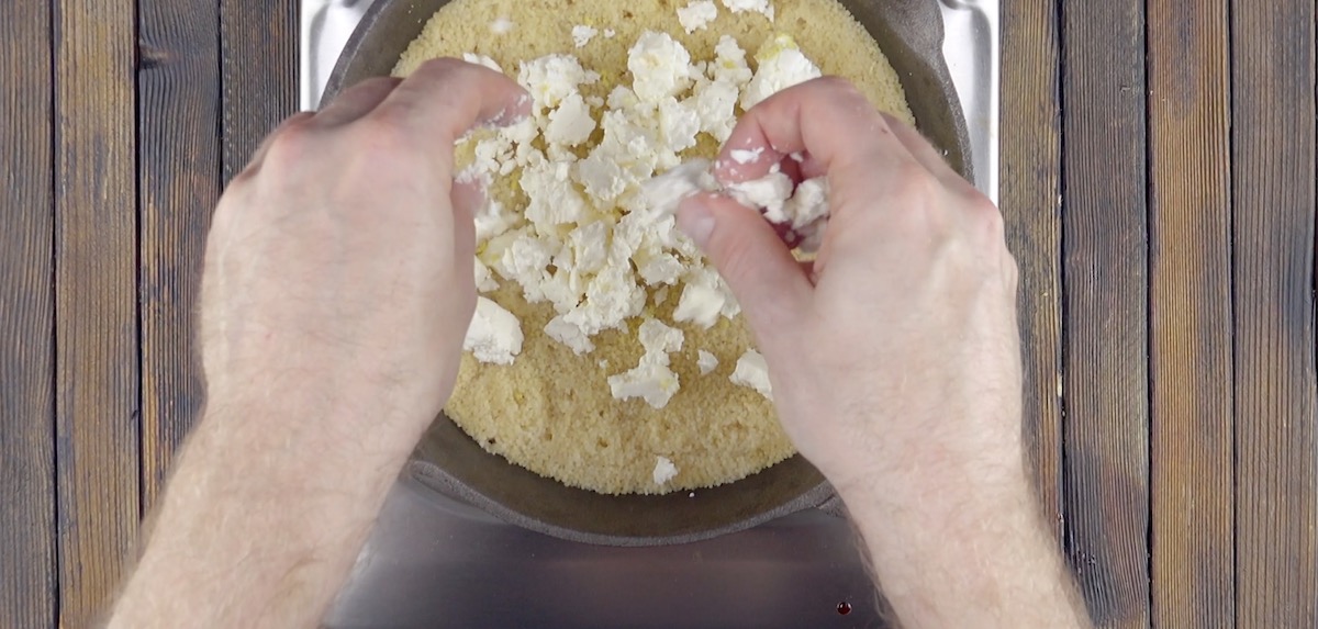 2.2) Gib nun den Abrieb sowie den Saft einer Zitrone zum Coucous hinzu und brösele Fetakäse hinein.