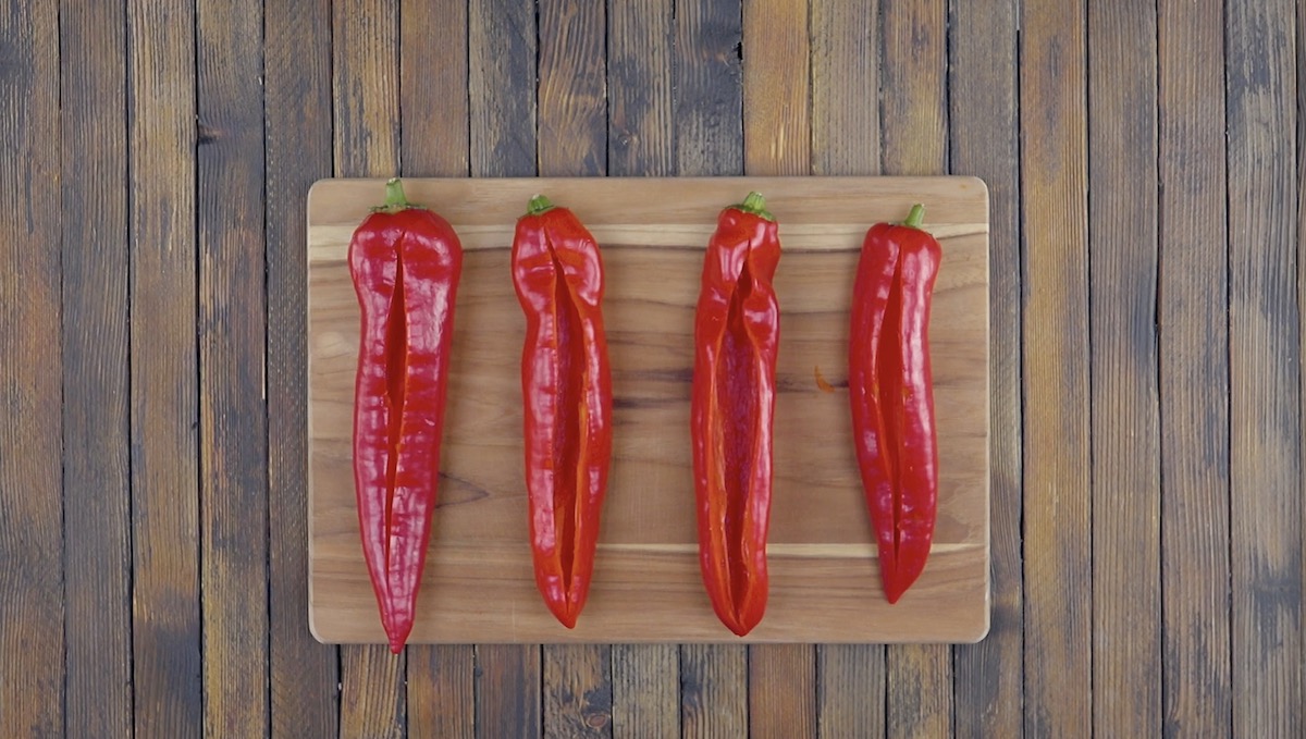 1.4) Wasche die vier Spitzpaprikas ab, schneide sie längs mit einem Messer auf und höhle sie aus.