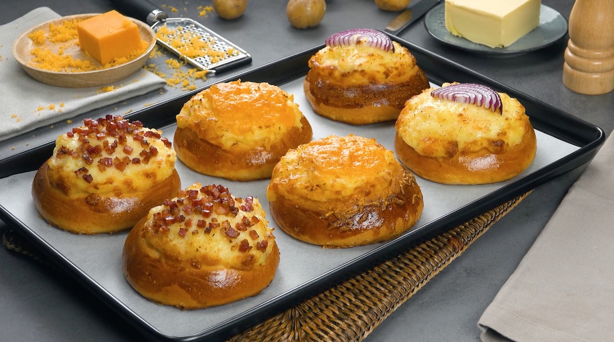 3. Belege die gefüllten Brötchen nun nach Belieben beispielsweise mit Bacon, Cheddar oder Zwiebeln. Lasse sie dann nochmal für 20 Minuten gehen, streiche den Teig dann abschließend mit Eigelb ein und backe die Brötchen für 25 Minuten bei 200 °C Ober-/Unterhitze, bis sie goldbraun sind.