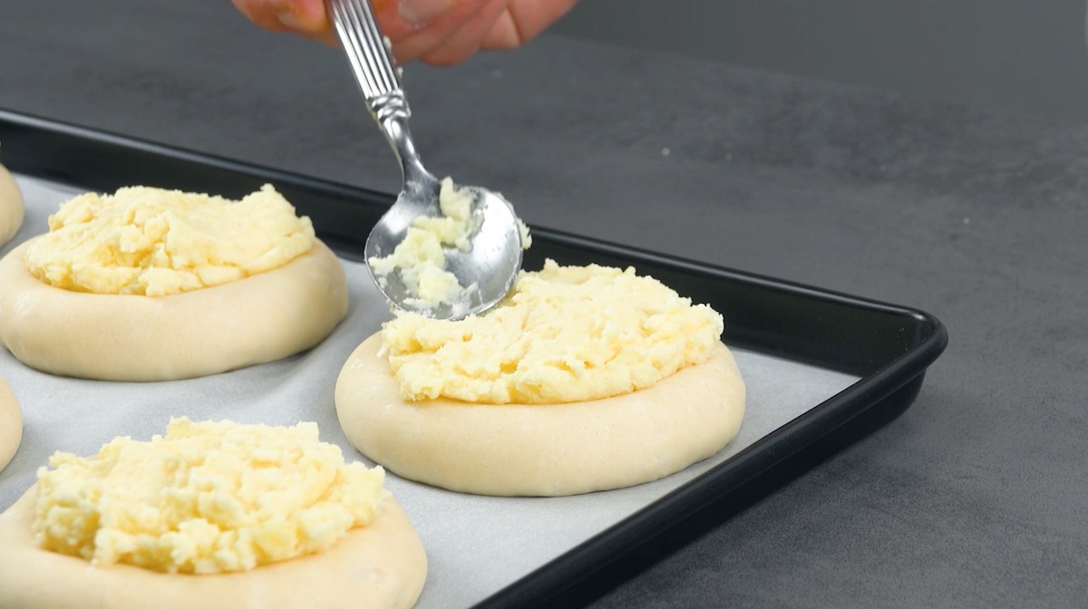2. Stampfe die Kartoffeln mit Käse und Sahne zu einer Masse und fülle diese in die Mulden der Hefeteige.