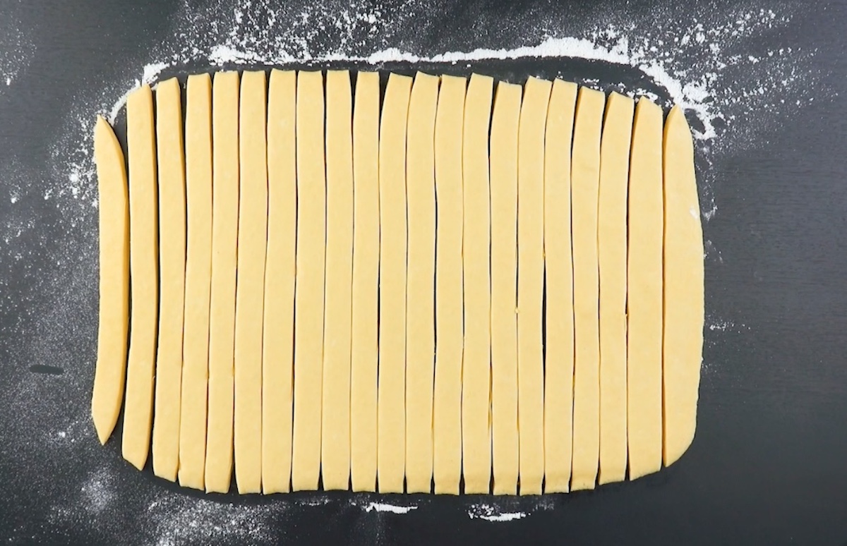 8. Rolle den Blätterteig zu einem Rechteck aus und schneide ihn in fingerbreite Stücke.