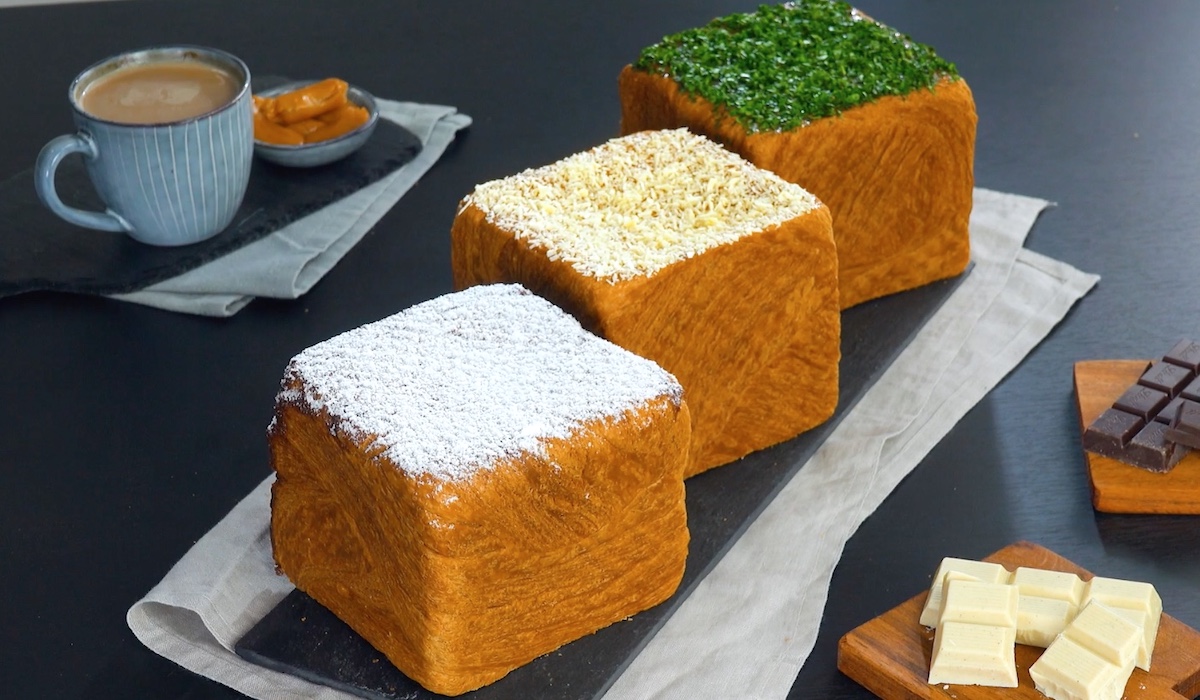 10. Stürze die Kastenform auf ein Backblech, beschwere sie und backe das Ganze zunächst für 15 Minuten bei 200 °C Umluft. Reduziere dann die Temperatur auf 170 °C und backe die gefüllten Blätterteige für weitere 60 Minuten. Löse die Blätterteig-Würfel aus der Form und garniere sie – passend zur Füllung – mit Petersilie, weißer Schokolade und Puderzucker.