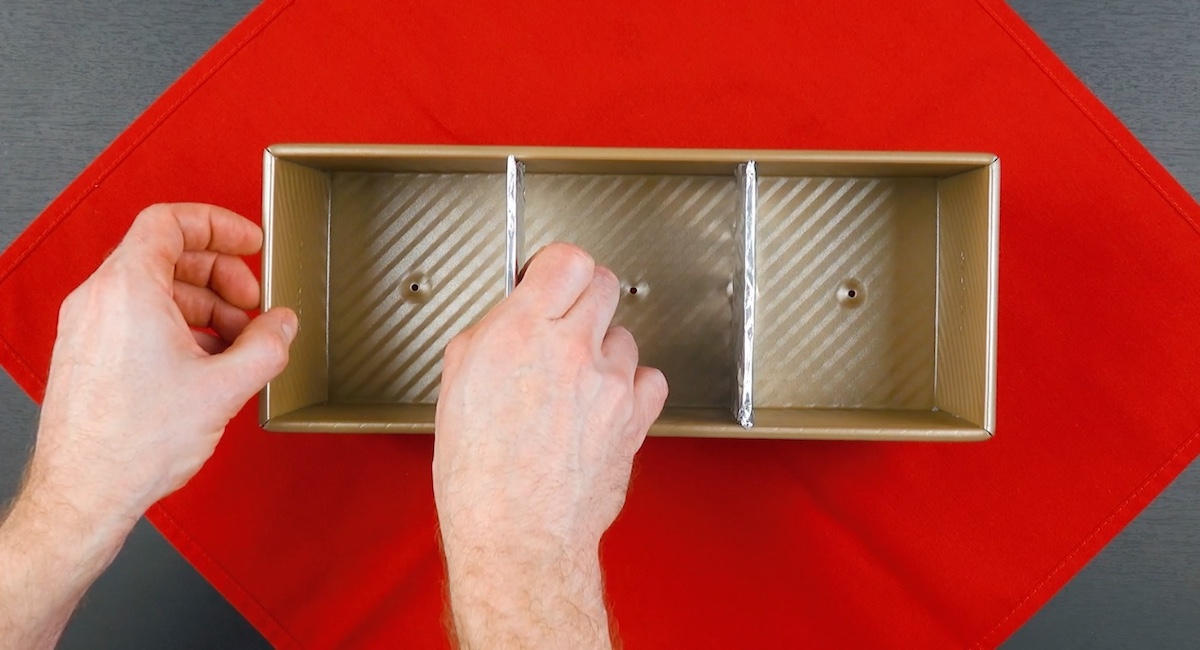 8. Schneide aus Pappe Trennwände für die Backform zurecht und wickle sie in Alufolie ein. Trenne mit ihnen dann die eingefettete Backform in drei gleich große Kammern ein.