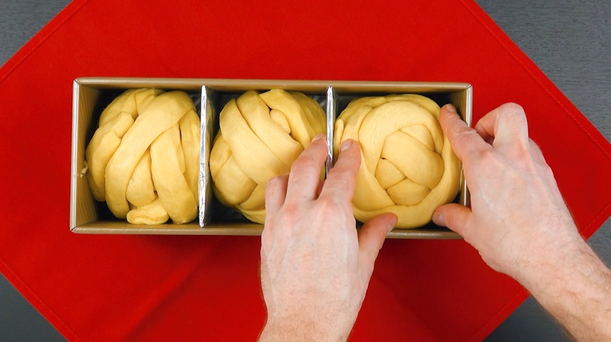 9. Wickle nun Schokolade, Cheddar und Karamellbonbons in die Teigstreifen ein, sodass drei Bälle aus Blätterteig mit je einer Füllung entstehen. Lege die Blätterteig-Bälle dann in die Kastenform.