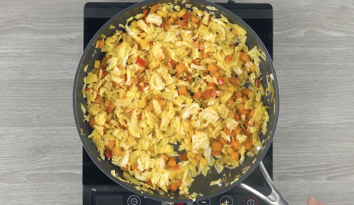 4.) Schneide das Innere des Wirsingkohls, Karotte, Paprika, Zwiebel sowie Knoblauch klein und brate alles in einer Pfanne in Öl an. Würze mit Fenchelsamen, Salz und Pfeffer. Gib alles in eine Schüssel und lasse es etwas abkühlen.