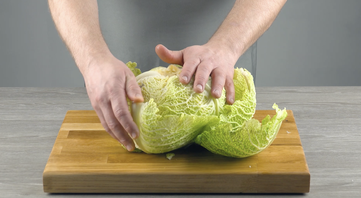 So geht es: 1.) Entferne den Strunk vom Wirsing und nimm die äußeren Blätter ab.