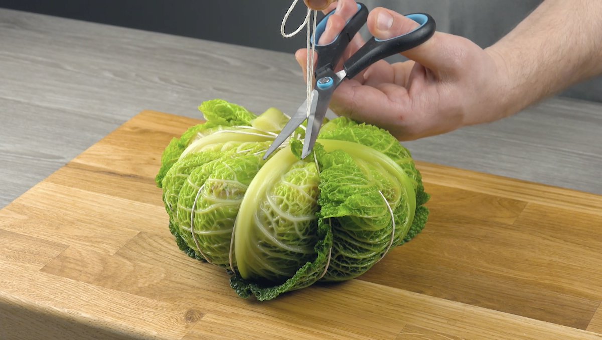 7.) Lege nun Bratenschnur wie ein Spinnennetz aus und lege den gefüllten Wirsing (ohne Frischhaltefolie) in die Mitte. Verknote jetzt die gegenüberliegenden Schnüre über dem Wirsing. Schneide den Rest der Schnur mit einer Schere ab.