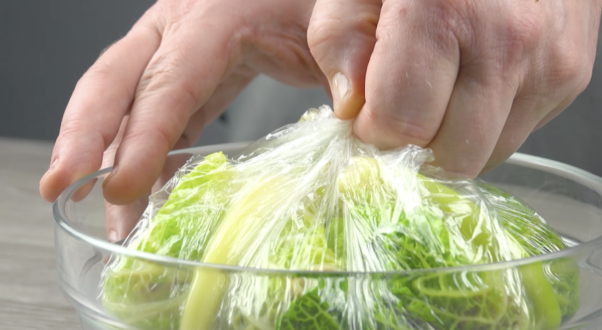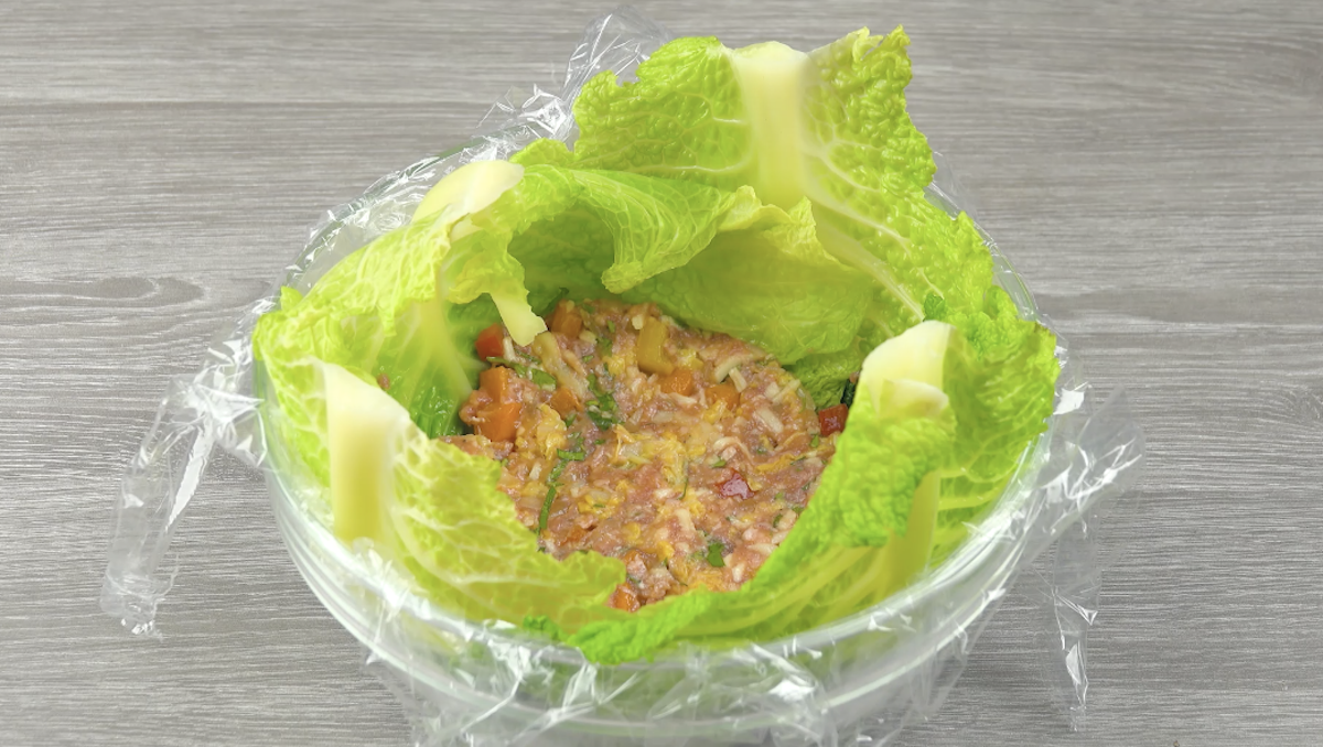 6.) Schichte nun abwechselnd Wirsing und Hackfleischmasse in die Schüssel. Die letzte Schichte sollte Wirsing sein. Drehe mithilfe der Frischhaltefolie alles zu einer Kugel zusammen und stelle den Kohl für mindestens 2 Stunden in den Kühlschrank.
