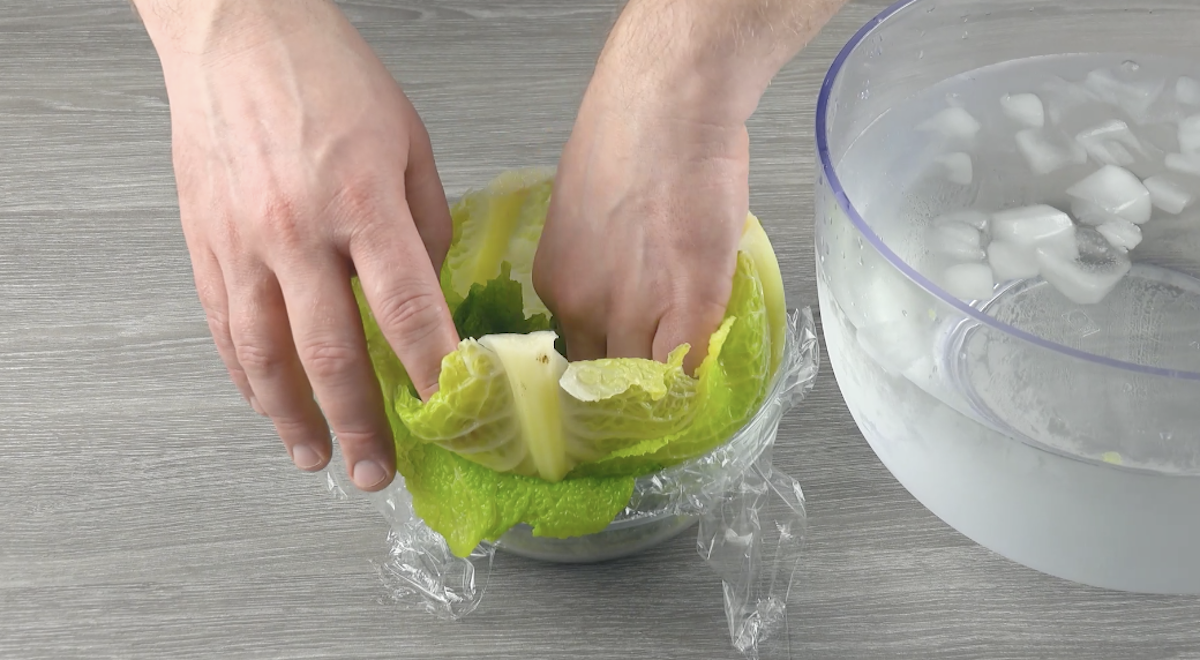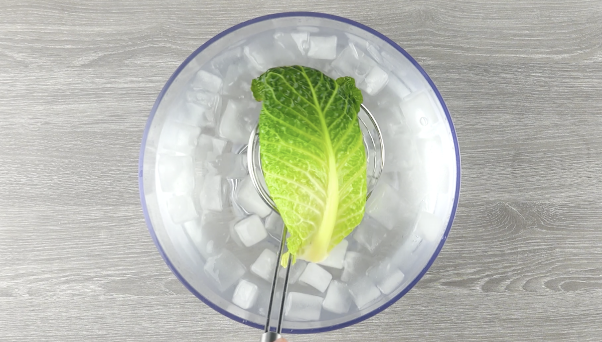 2.) Koche die äußeren Blätter ca. 2 bis 3 Minuten in Salzwasser und schrecke sie dann in Eiswasser ab.