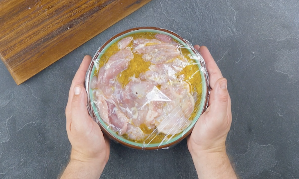 1. Löse die Hähnchenschenkel vorsichtig vom Knochen, sodass die Haut unversehrt bleibt. Verrühre Milch, Öl, Kreuzkümmel, Knoblauch, Salz und Pfeffer in einer Schüssel miteinander und mariniere das Fleisch darin: Stelle es, abgedeckt mit Frischhaltefolie, für mindestens 2 bis 3 Stunden, am besten aber über Nacht, in den Kühlschrank.
