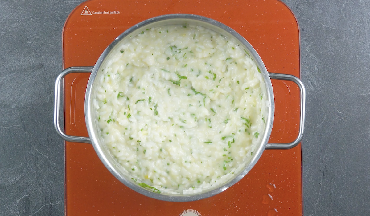 2. Schwitze die gewürfelte Zwiebel in einem großen Topf in Butter glasig an. Gib den Reis dazu und brate ihn kurz mit an. Lösche mit Weißwein ab und lasse ihn einreduzieren. Gieße von der Hähnchenbrühe 300 ml hinzu und lasse alles bei geschlossenem Deckel 15 Minuten schwach köcheln. Rühre zwischendurch immer wieder mal um. Gieße dann die restliche Brühe auf und lasse das Ganze weitere 10 Minuten köcheln. Gib danach geriebenen Käse hinzu und verrühre alles gut miteinander. Jetzt kannst du das Gericht noch mit Petersilie, Schnittlauch, Salz und Pfeffer würzen.