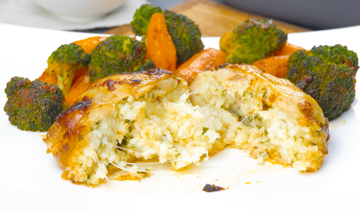 Das perfekte Rezept für Hähnchenfleisch! Wir befüllen mit einem kleinen Trick das saftige Fleisch des Hähnchenschenkels mit einem käsigen Risotto (Parmesan und Bergkäse). Serviert werden diese schmackhaften Hähnchentaschen mit Ofengemüse, Brokkoli und Karotten. Supereinfach und schnell gemacht.