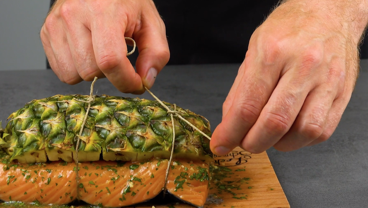 5.) Biege das Ananas-Stück etwas auseinander und lege es auf den Lachs. Binde die Frucht schließlich noch mit dem Küchengarn am Lachs fest.