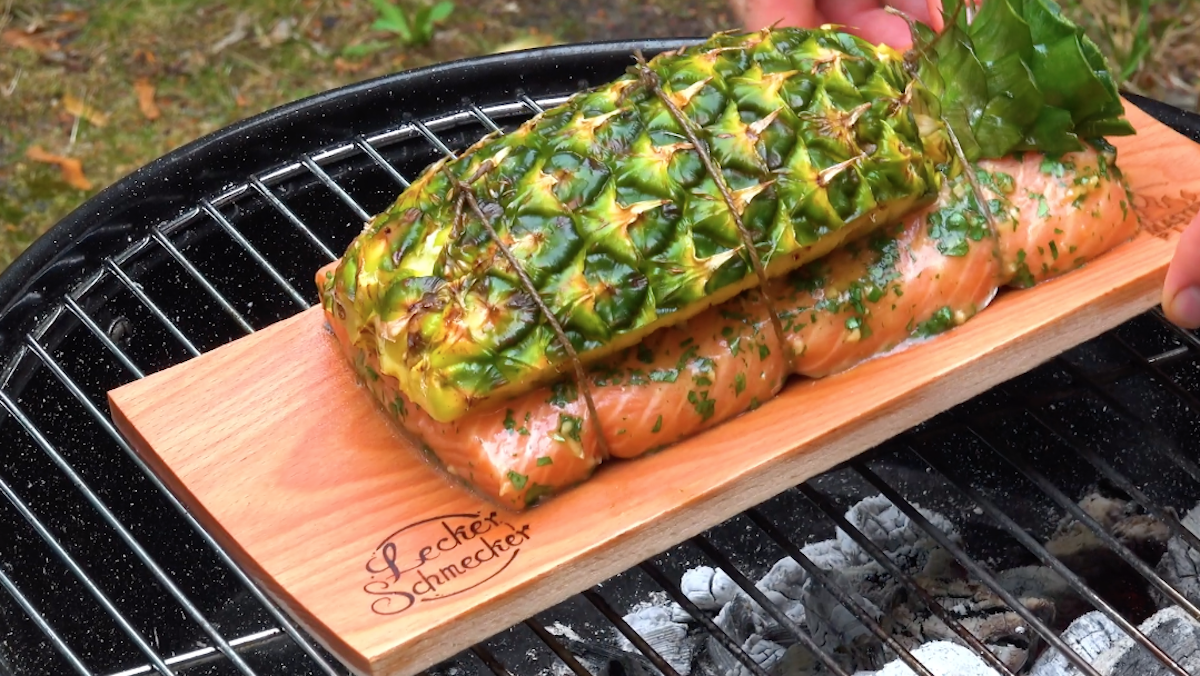 Ein köstliches Grillrezept, das herrlich frisch und besonders lecker schmeckt. Das Grillbrett sorgt für die extrarauchige Note und die Ananas verleiht dem Lachs ein schönes, fruchtiges Aroma. Du möchtest auch unbedingt ein extrarauchiges und würziges Aroma durch so ein Grillbrett erzielen? Das Tolle an diesen Brettern ist, dass das Fleisch oder der Fisch beim Grillen nicht so schnell anbrennt und auch nicht am Grillrost kleben bleibt. Durch die Bretter wird das Grillgut schonend durchgegart, ohne dass die Außenseite verbrennt und schwarz wird. Ein weiterer Vorteil an diesen Brettern ist, dass das Grillgut schön saftig bleibt. Unsere tolle Leckerschmecker-Edition beinhaltet drei Grillbretter aus verschiedenen Holzarten, die sich aufgrund ihres Raucharomas hervorragend für das geschmacksverstärkende Grillen eignen. Folgende Aromen sind in dem Set zu finden: Buchenrauch, Zedernrauch und Hickoryrauch. Und so geht es: Lege das Brett vor dem Grillen mindestens 2 Stunden in Wasser ein. Auch Bier, Orangensaft, Wein, Whiskey, Rum oder Apfelsaft eignen sich hier für das besondere Geschmackserlebnis. Dann kann es losgehen. Lege das Brett anfangs für 2 bis 3 Minuten direkt über die Flamme, bis es leicht raucht. Danach kannst du das Grillbrett mit dem Grillgut belegen und dieses im indirekten Grillbereich schonend garen lassen. Achte beim Belegen der Grillbretter darauf, dass das Grillgut nicht über den Rand des Brettes hinausragt, da es sonst verbrennen könnte. Nicht benutzte, aber bereits gewässerte Bretter können eingefroren werden. Zum nächsten Grillen steht somit sofort ein gebrauchsfertiges Brett zur Verfügung. „Profigriller“ verfahren ausschließlich so. Die Bretter nehmen in der Kühltruhe nicht viel Platz ein und sind unbegrenzt haltbar. Besonders gut eignen sich die Grillbretter auch als Servierunterlage. Sofern sie noch heiß sind, sollte natürlich ein feuerfester Untergrund vorhanden sein. Hier kannst du unsere Leckerschmecker-Grillbretter bestellen. Wir wünschen euch eine tolle Grillsaison!