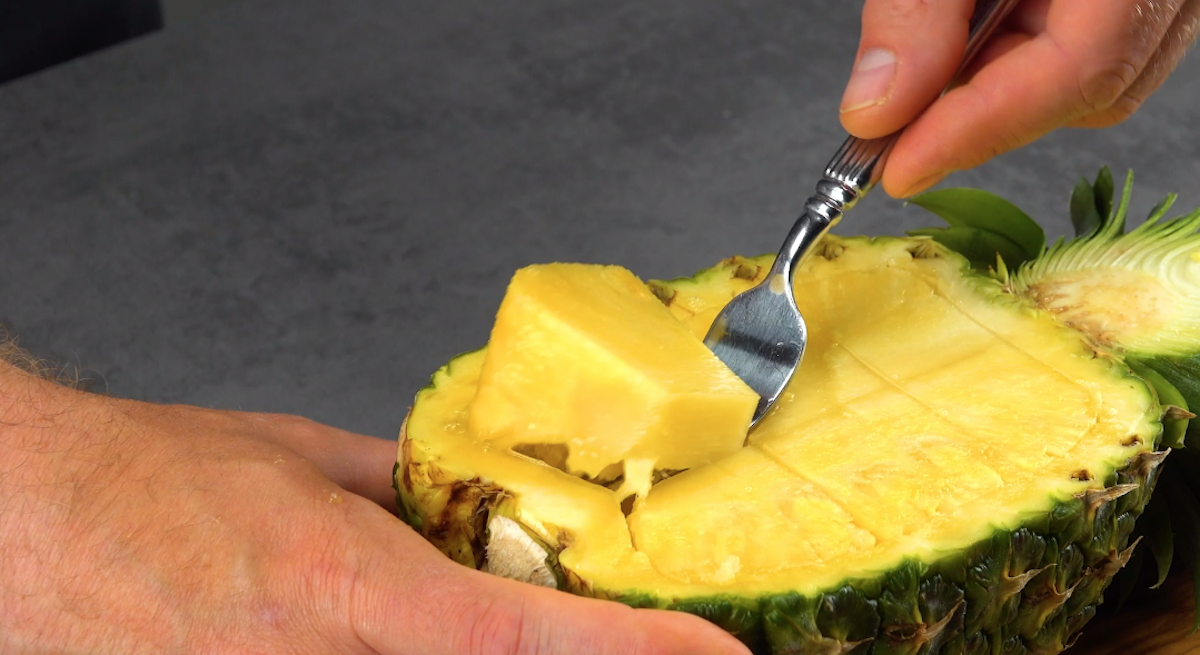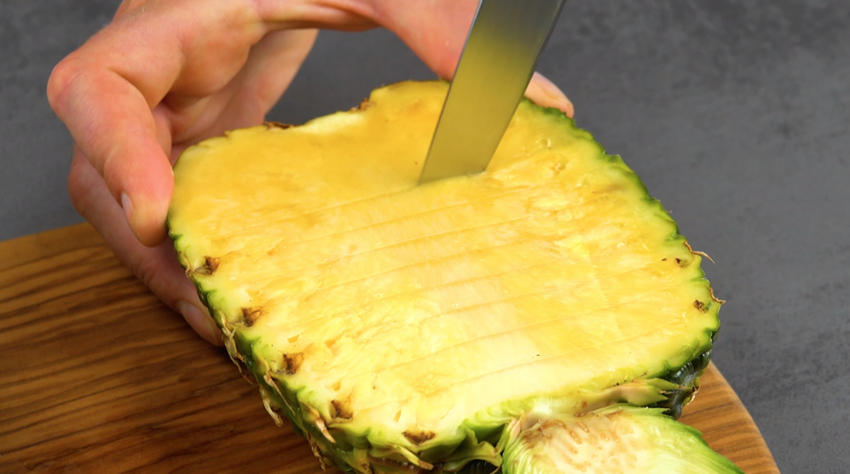 4.) Schneide ca. 1/3 einer Ananas der Länge nach ab und ritze das Fruchtfleisch quer ein.