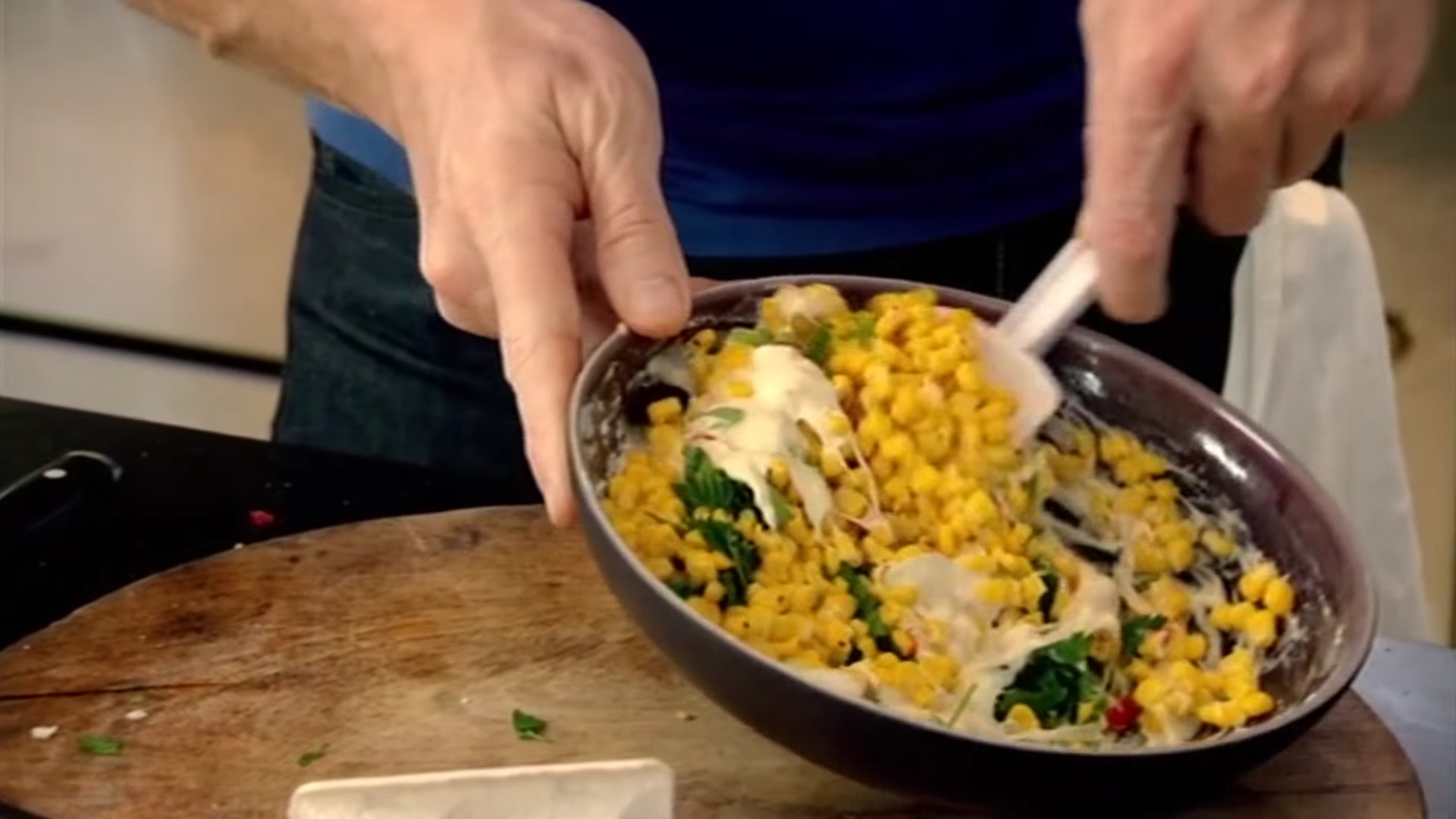 Schneide die Paprika in kleine Stücke und die Maiskerne vom Kolben – dieser Arbeitsschritt entfällt natürlich beim Dosenmais. Koriander, Zwiebeln, Knoblauch und Jalapeño werden fein gehackt. Mische alle diese Zutaten mit dem Saft der Limette, Mais, Salz und Pfeffer in einer großen Schüssel. Nun gibst du das Ei hinzu, danach Mehl.