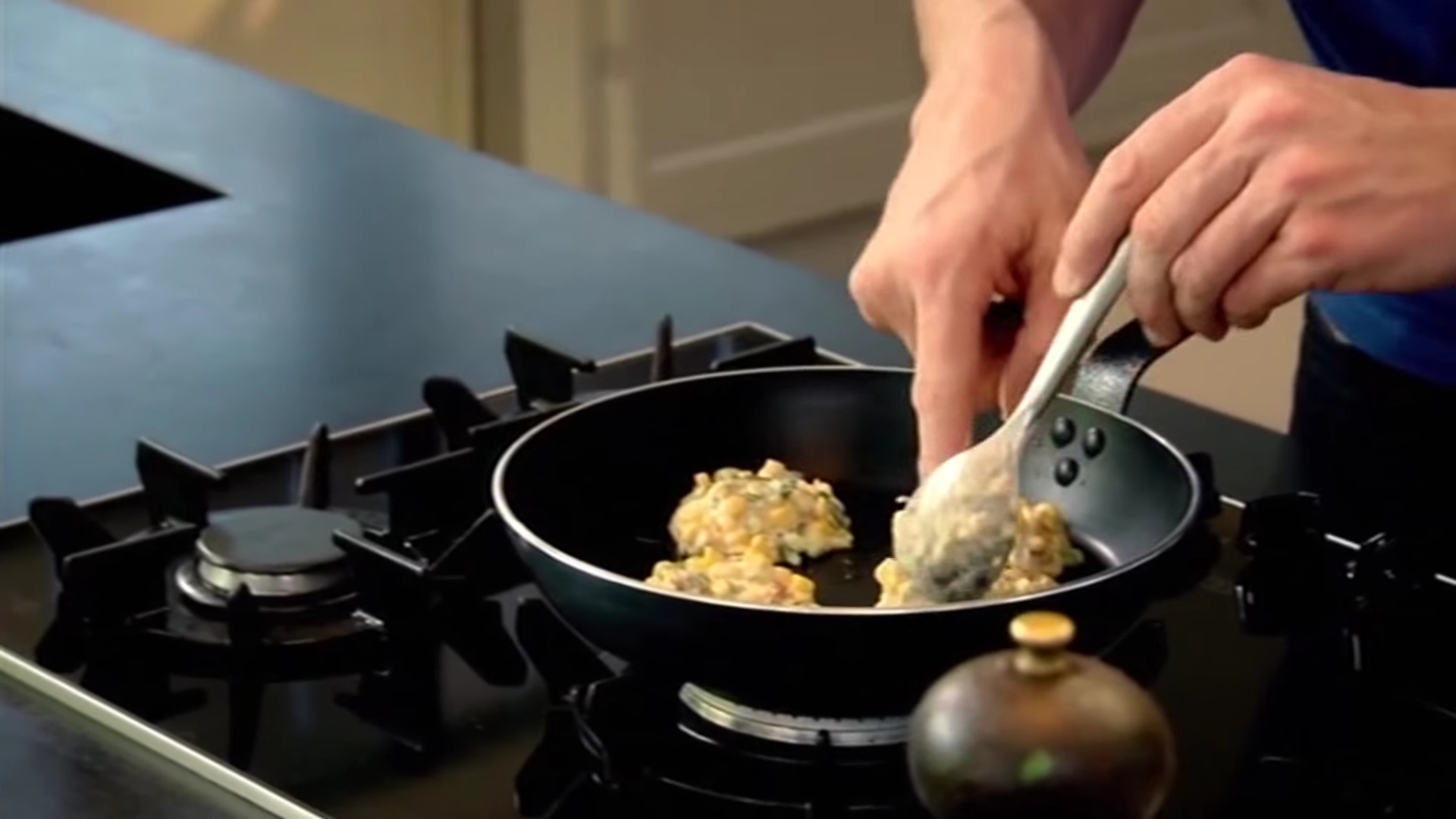 Erhitze Olivenöl in einer Pfanne auf mittlerer Temperatur. Gib einen großen Esslöffel Teig in die Pfanne und brate ihn von beiden Seiten bis er goldbraun ist. Auf diese Weise sollten drei bis vier Maispuffer gleichzeitig in die Pfanne passen.