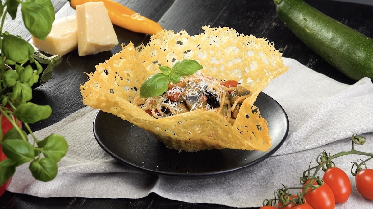 Mit Gemüse angerichtete Spaghetti in einer krossen Schale aus Parmesan servieren – das klingt definitiv ungewöhnlich, dabei ist die Zubereitung gar nicht so aufwendig wie sie zunächst klingt. Tatsächlich hat das Ganze sogar einen Vorteil, denn nach dem Essen gibt es weniger zum Abwaschen, denn die Schale kann samt der Nudeln verspeist werden.