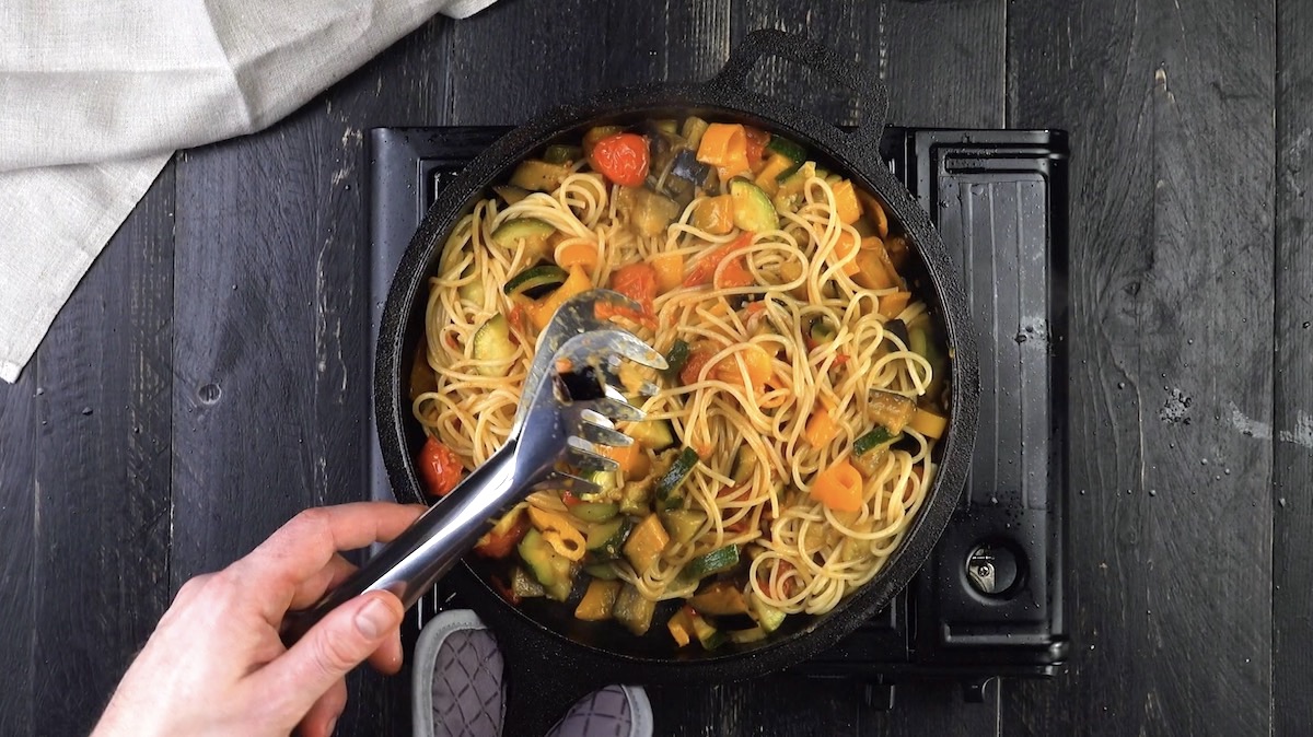 Spaghetti & Co. werden häufig mit Käse überbacken, denn eine goldbraune Käsekruste sowie geschmolzene Käsefäden verleihen Nudeln das geschmackliche Etwas. Wir haben den Spieß jedoch umgedreht und in diesem Rezept den Käse nicht über die Nudeln, sondern die Nudeln über den Käse gegeben. Alles, was du dafür brauchst, sind Parmesan, Spaghetti, Gemüse und den Mut, etwas Neues, Knuspriges auszuprobieren.