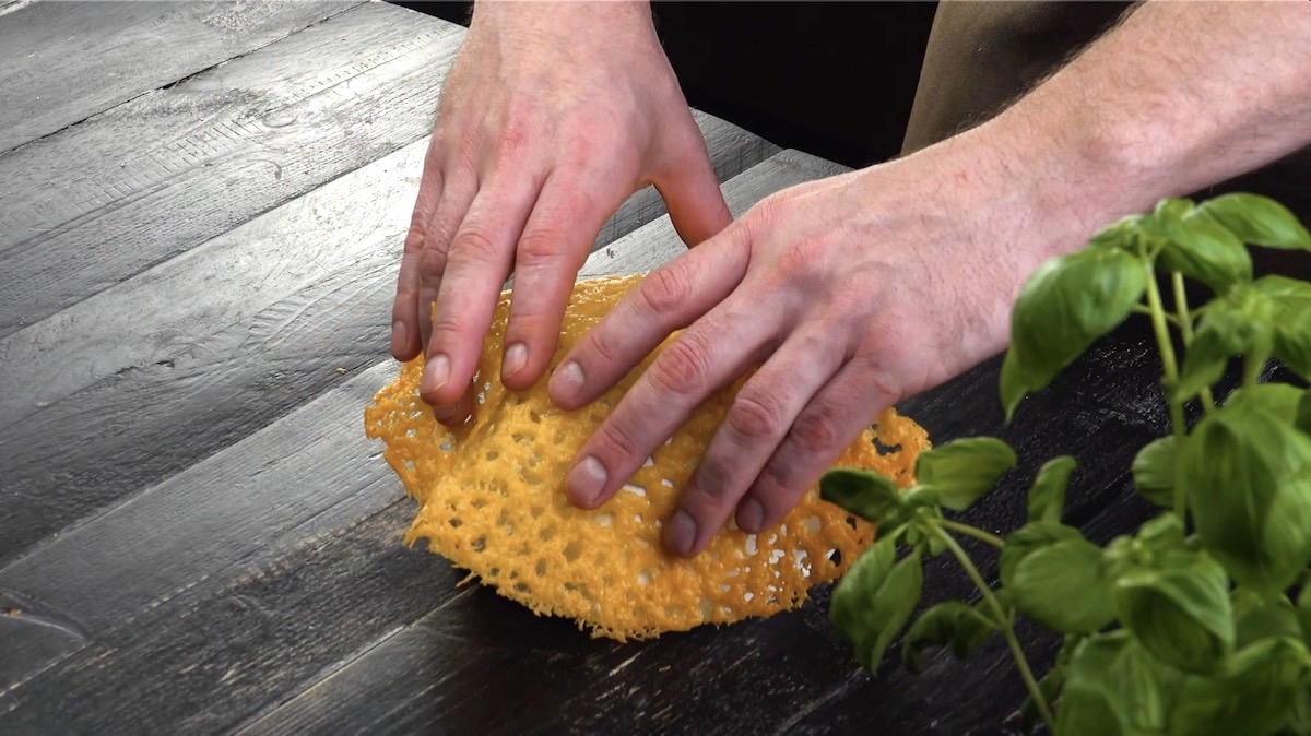 1.) Verteile den Parmesan kreisförmig auf einem mit Backpapier ausgelegten Blech und backe ihn für 7 Minuten bei 190 °C Ober/-Unterhitze. Lass den Käse anschließend etwas abkühlen; lege ihn aber noch warm auf eine umgedrehte Schüssel, drücke ihn vorsichtig an und lass ihn dann komplett auskühlen.