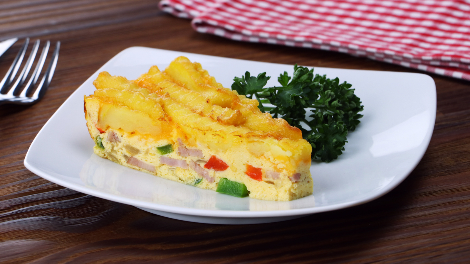 4.) Pommes-Torte Ein deftiges Hauptgericht in Form einer Torte: Pommes, Eier, Gemüse und – wie sollte es anders sein? – Käse werden zu einer schmackhaften Pommes-Torte zusammengeführt.