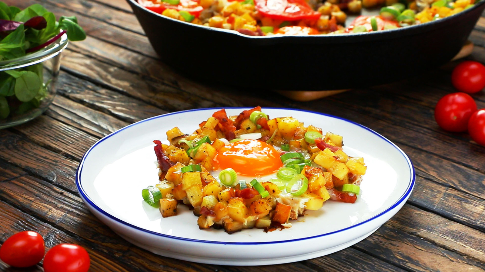 5.) Kartoffel-Ei-Pfanne Bratkartoffeln müssen nicht immer in Scheiben serviert werden, sondern können auch gewürfelt und mit einem Spiegelei garniert daherkommen, so wie bei dieser Kartoffel-Ei-Pfanne.