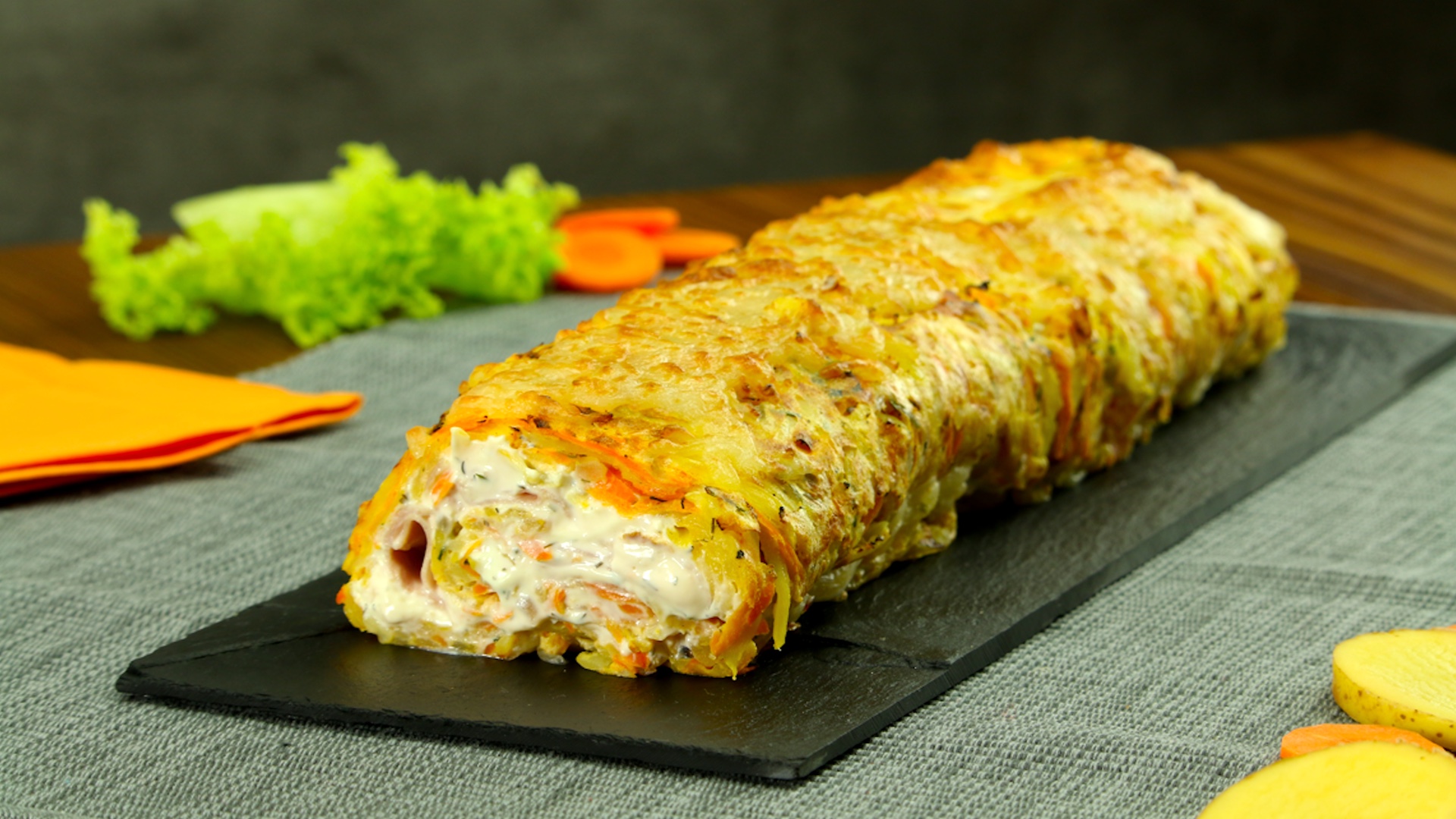 Werden Kartoffeln in hauchzarte Scheiben geschnitten, scheint die Situation glasklar zu sein: Ein Bratkartoffelgericht landet auf der Tafel. Doch Leckerschmecker wäre eben nicht Leckerschmecker, würde es nicht ganz neue kulinarische Ideen auf den Teller zaubern. Deswegen kombinieren wir unsere Knollenscheibchen mit einer verführerischen Füllung zu einer wohlsortierten Kartoffelrolle.