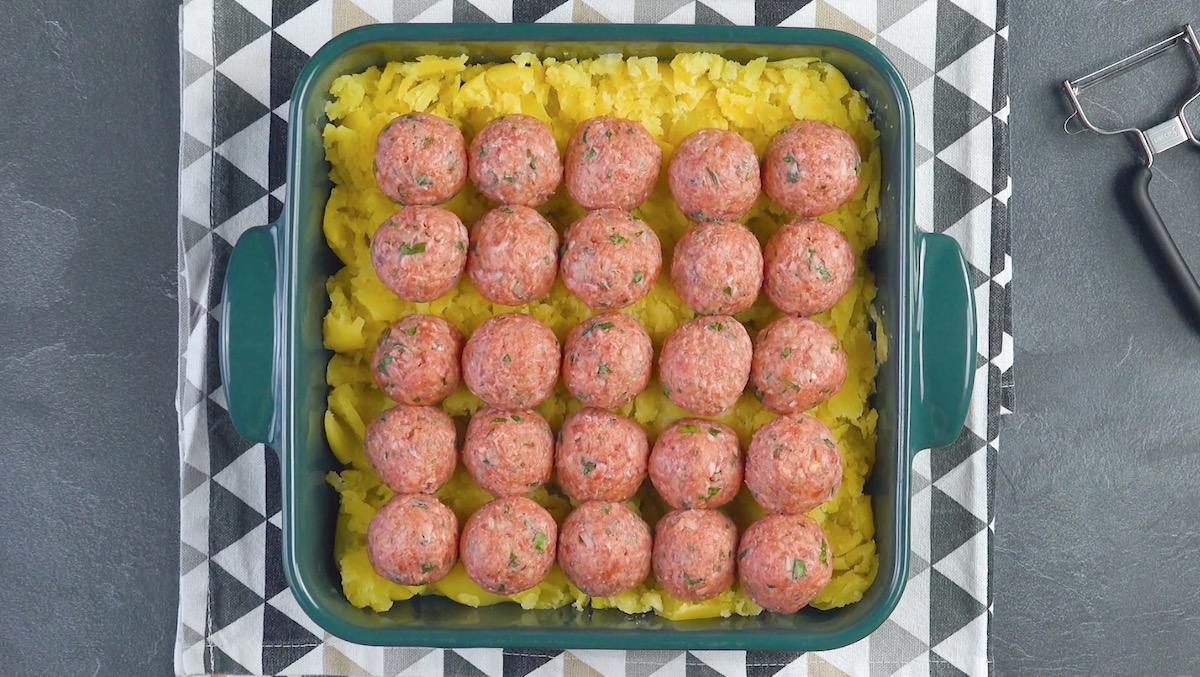 5. Gib die gekochten Kartoffeln und die Kartoffelenden in die Auflaufform, zerstampfe sie und lege die Hackbällchen darauf.