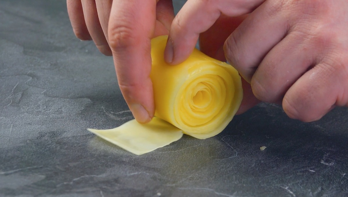 7. Hole die Butterplatte aus dem Tiefkühler, löse das Backpapier und lege die Platte oben auf die Kartoffelrollen.