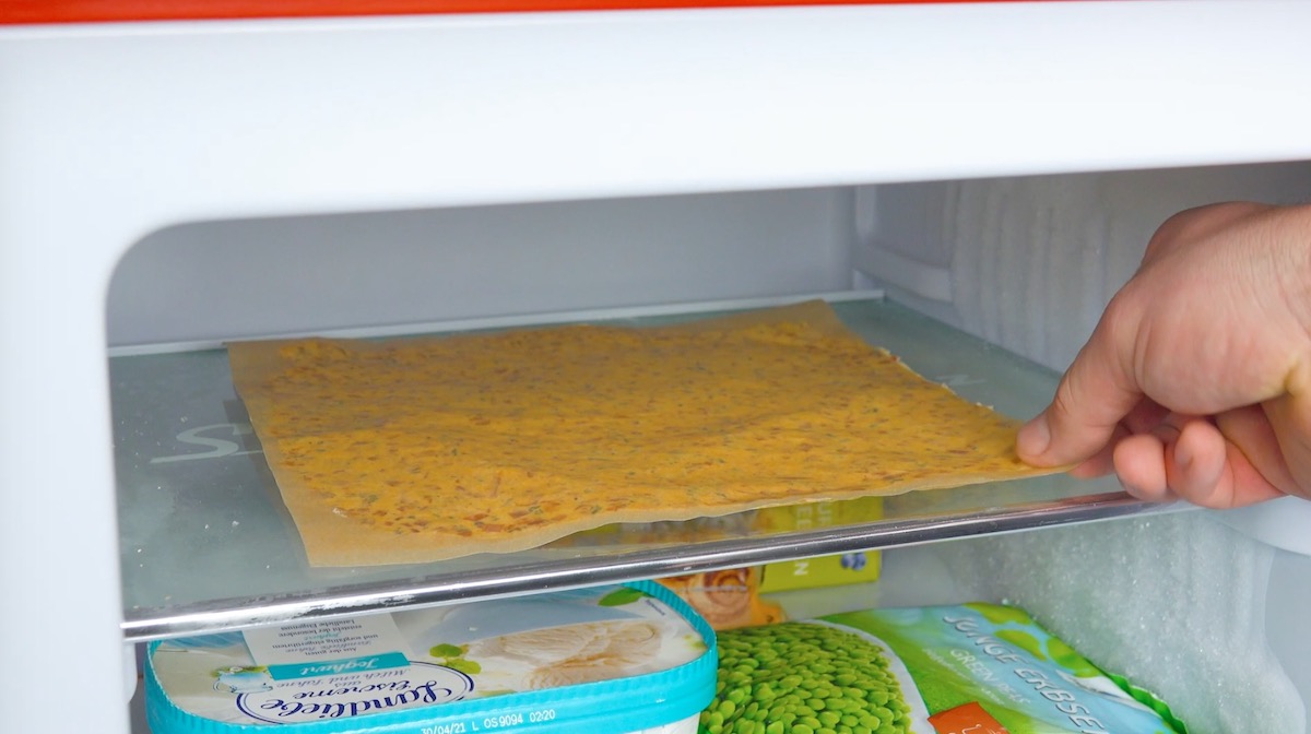 So geht es: 1. Vermische zunächst alle Zutaten für die Butterplatte miteinander. Plätte die Masse anschließend zwischen zwei Stück Backpapier – und zwar so weit, dass sie etwas kleiner als deine Auflaufform ist. Lege die Platte dann für ca. 30 Minuten in den Tiefkühler.