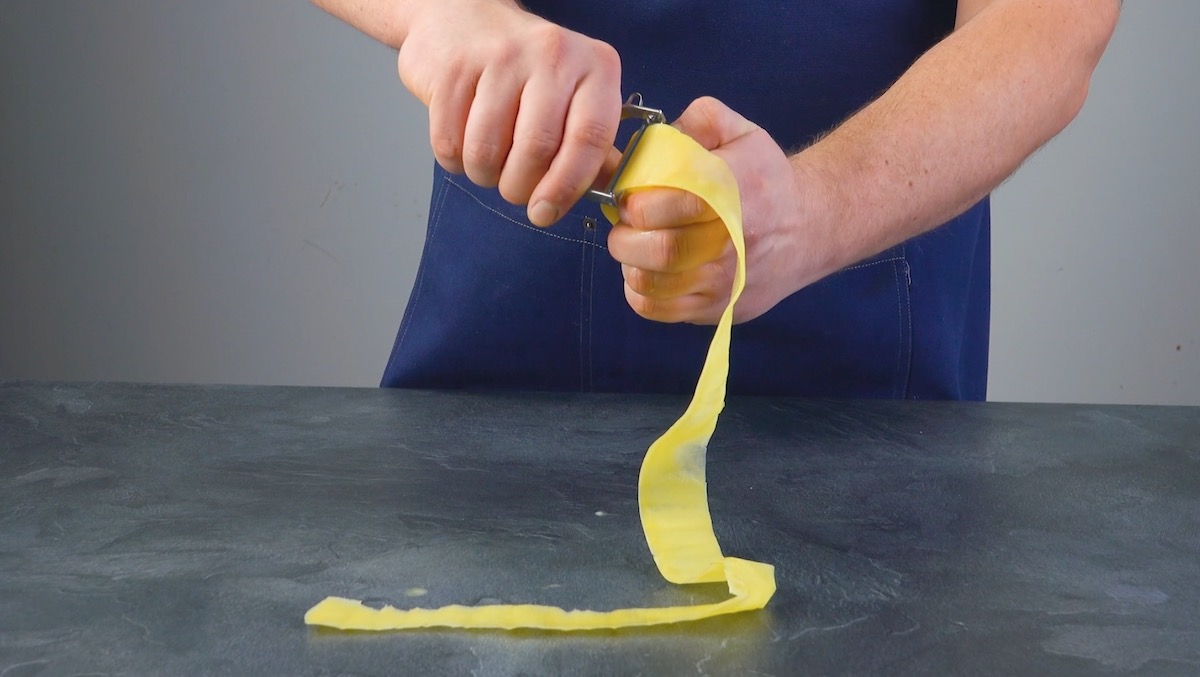 2. Schäle die Kartoffeln. Schneide von 9 Kartoffeln die Enden ab. Schneide die nun etwa 4 cm dicken Kartoffelmittelstücke mit einem Sparschäler zu Bändern. Koche die restlichen Kartoffeln sowie die Kartoffelenden in Salzwasser.