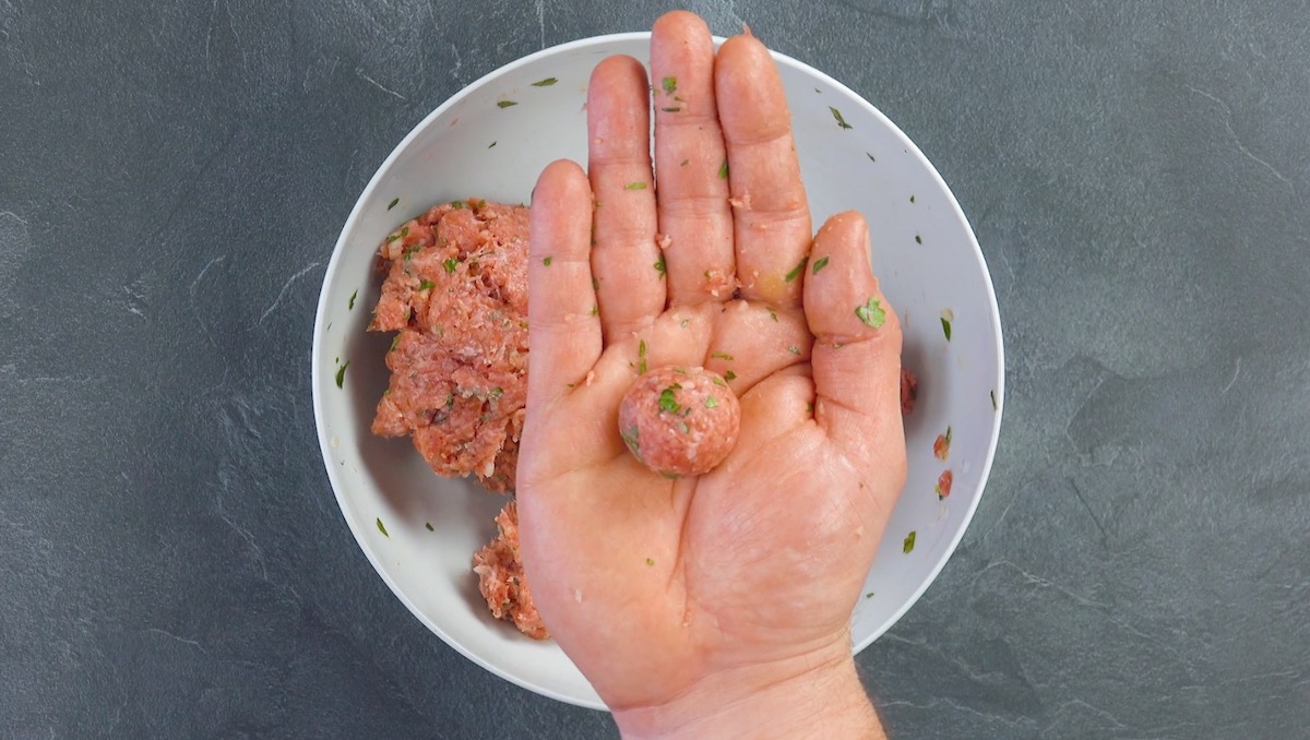 4. Vermische die Zutaten für das Hackfleisch miteinander. Forme dieses dann zu Hackbällchen, idealerweise 25 Stück.