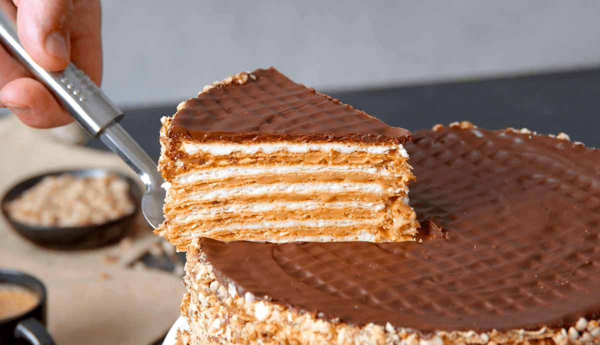 In eine Eiswaffel gehören Eiskugeln, normalerweise zumindest. Werden Eiswaffeln aber gedämpft, lassen sie sich auffalten und es entstehen ganz neue Möglichkeiten für ihre Verwendung – z.B. für unseren Waffelkuchen. Für den werden Eiswaffeln abwechselnd mit luftiger Frischkäsecreme und karamellisierter sowie gezuckerter Kondensmilch bestrichen. Geschichtet und mit Schokolade überzogen, entsteht dann eine Leckerei, die mit jedem herkömmlich gebackenen Kuchen problemlos mithalten kann.