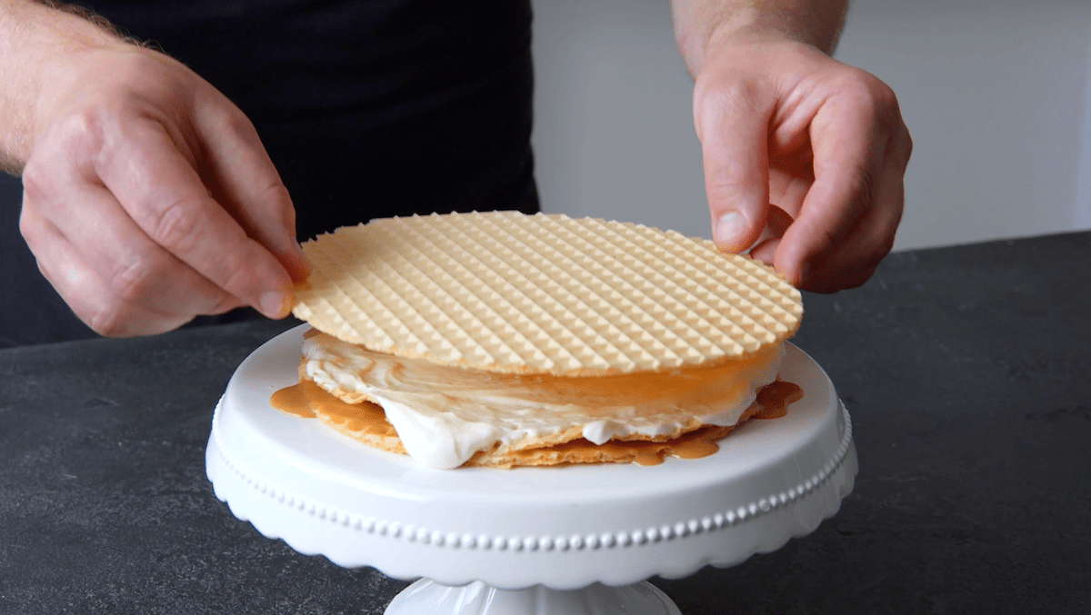 8. Wiederhole das Schichten, bis die letzte Waffel ganz oben liegt.