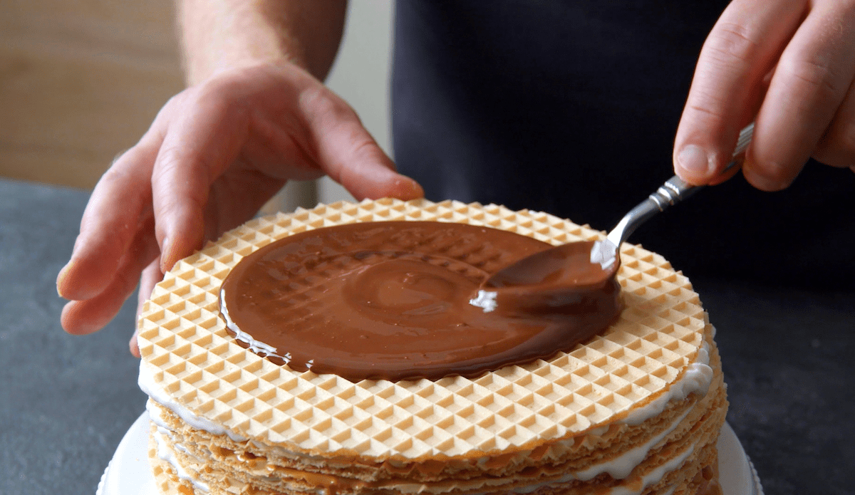 11. Stelle den Waffelkuchen vor dem Servieren für 30 Minuten in den Kühlschrank, damit die Schokolade wieder fest wird.