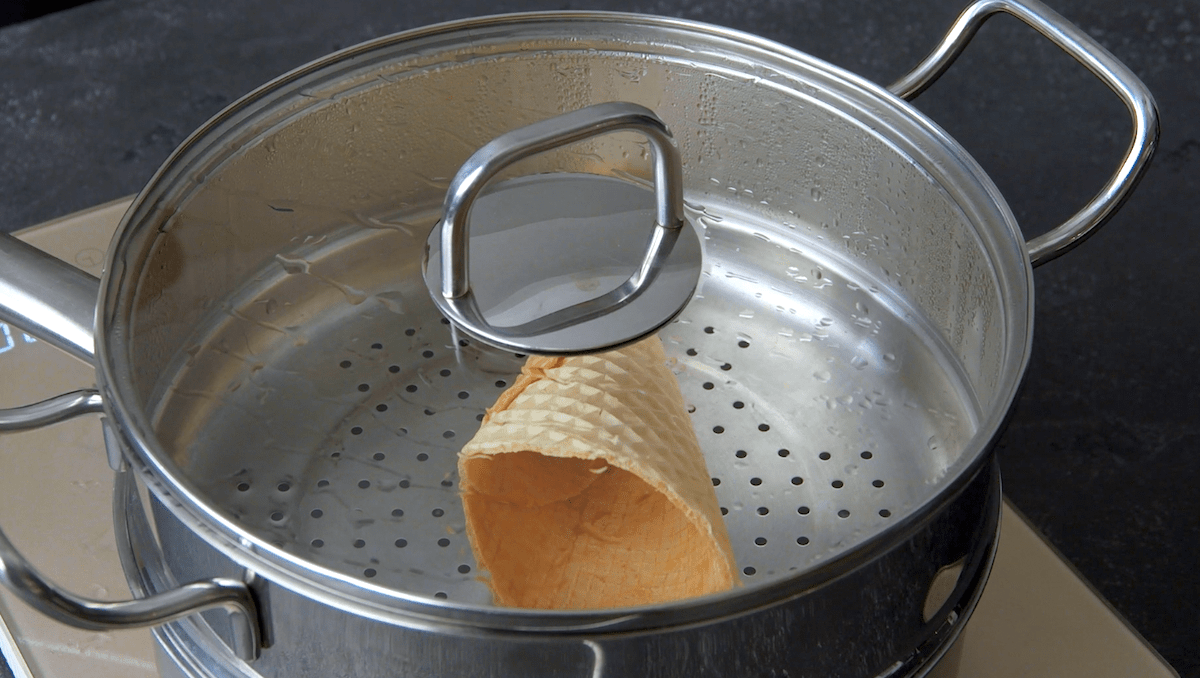 2. Dämpfe währenddessen die Eiswaffeln nacheinander über einem Wasserbad, damit sie weich werden.