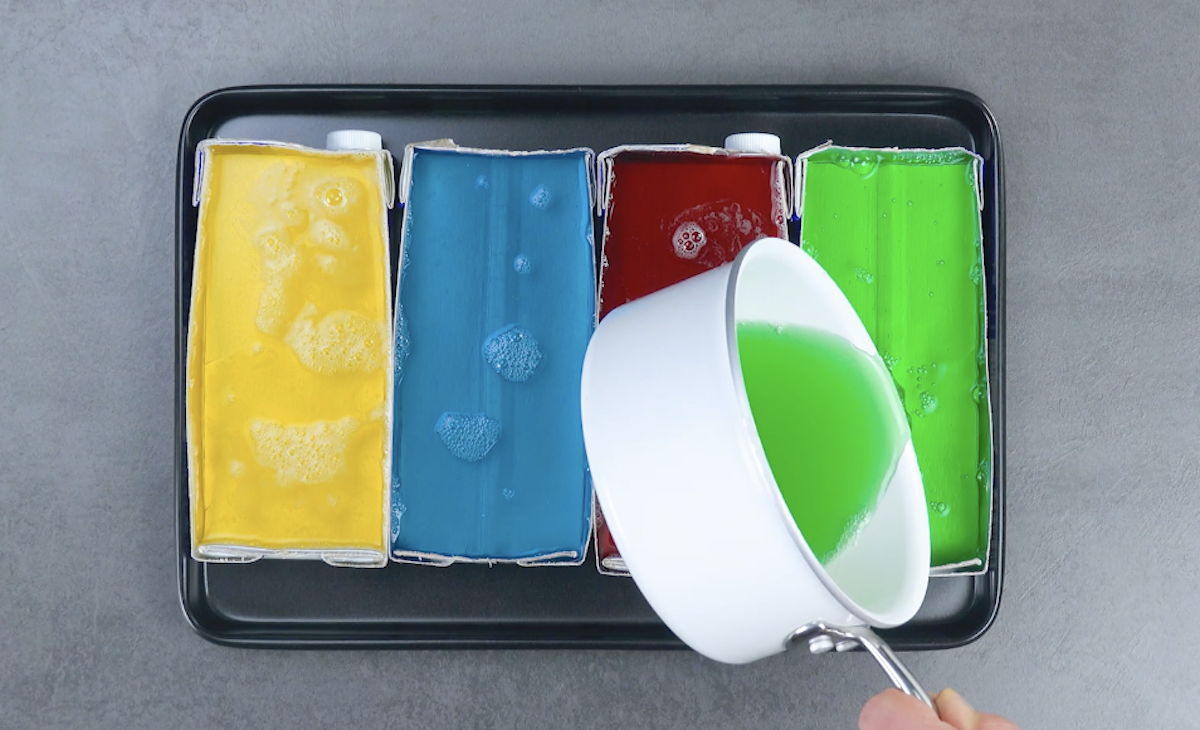 2. Gib für die verschiedenen Götterspeise-Farben jeweils das Pulver, Zucker, Gelatine und Wasser in einen Topf und erwärme alles zusammen, bis sich das Pulver aufgelöst hat. Fülle die farbigen Götterspeisen in je eine Milchkarton-Form und stelle die Formen für 4 Stunden in den Kühlschrank.
