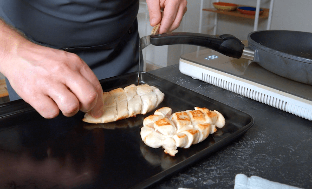 1. Schneide die Hähnchenbrüste auf der oberen Seite überkreuz ein und würze sie mit Salz und Pfeffer. Erhitze Öl in einer Pfanne und brate das Hähnchen mit der Einschnittseite nach oben kurz an, bis sich die Schnitte öffnen. Drehe das Hähnchen dann um und brate es von der anderen Seite kurz an. Lege das Hähnchen daraufhin auf ein Backblech.