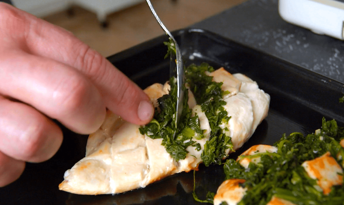 2. Schwitze in der Zwischenzeit Knoblauch in Butter an, gib Spinat hinzu und würze alles mit Salz, Pfeffer und Muskat. Verteile dann den Spinat in die Schlitze in den Hähnchenbrüsten.