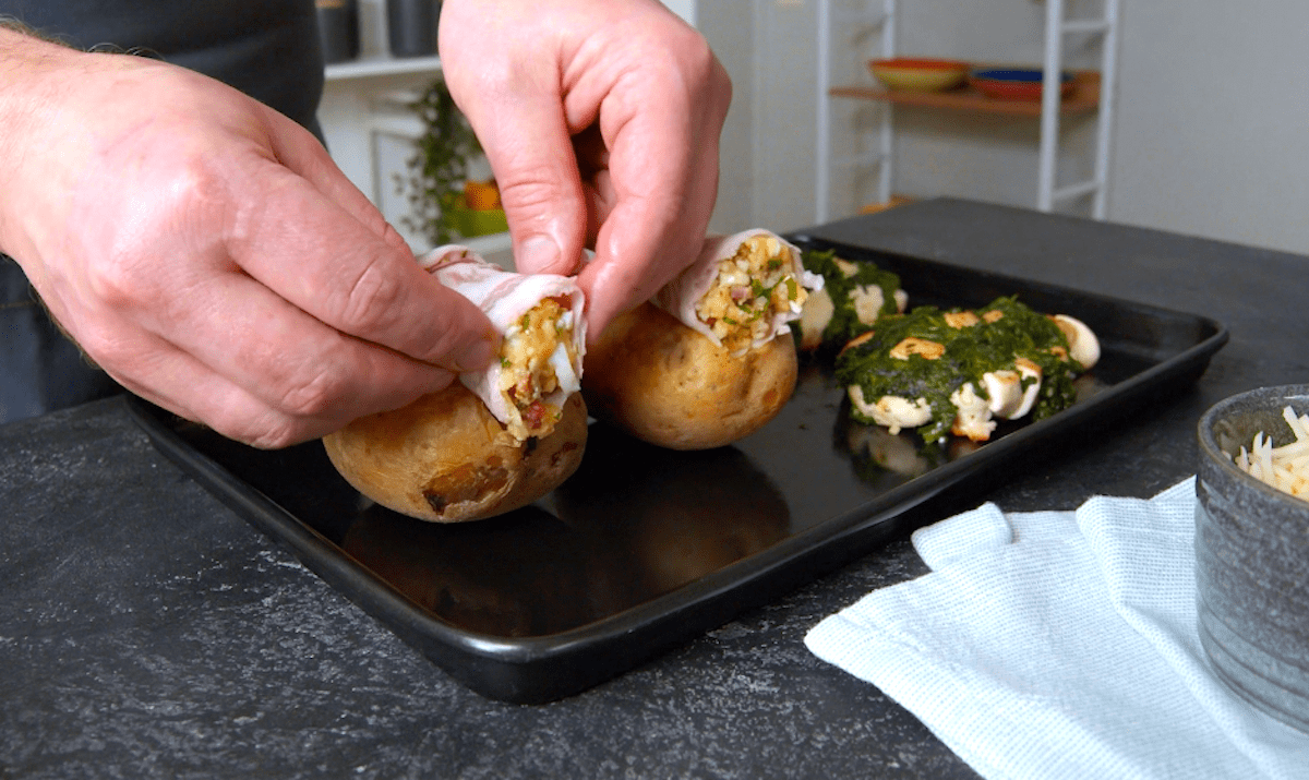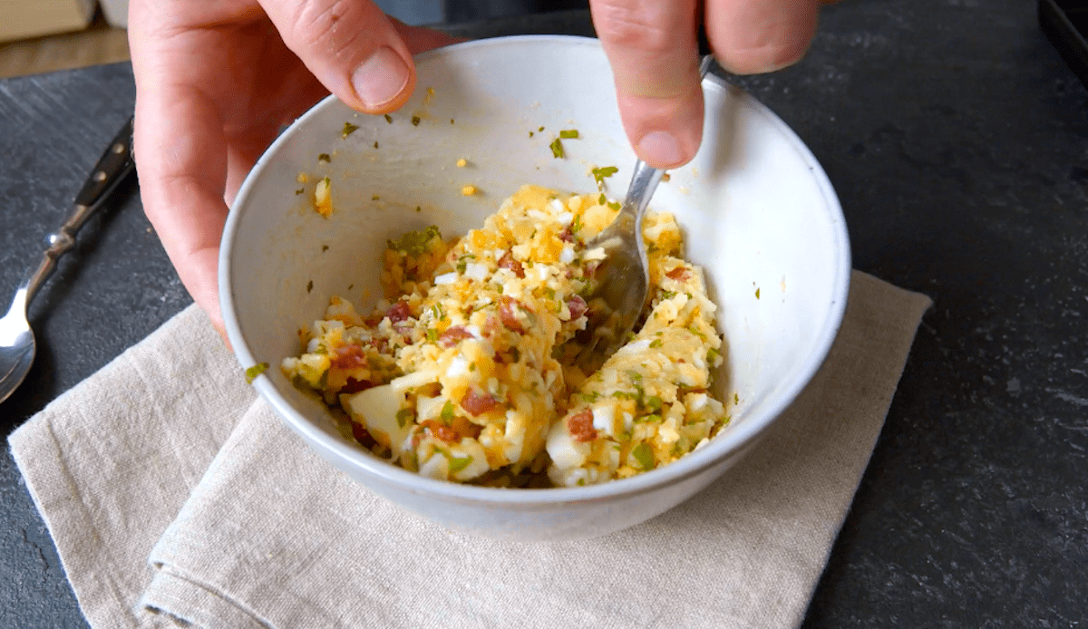3. Schneide bei den gekochten Backkartoffeln oberhalb ca. 1/4 keilartig heraus. Entferne die Schale von diesen beiden „Keilen“ und zerdrücke die Kartoffelmasse in einer Schüssel mit einer Gabel. Schneide gekochte Eier klein und gib sie mit den gebratenen Baconwürfeln, 25 g Käse und gehackten Kräutern mit in die Schüssel. Würze alles mit Salz und Pfeffer.